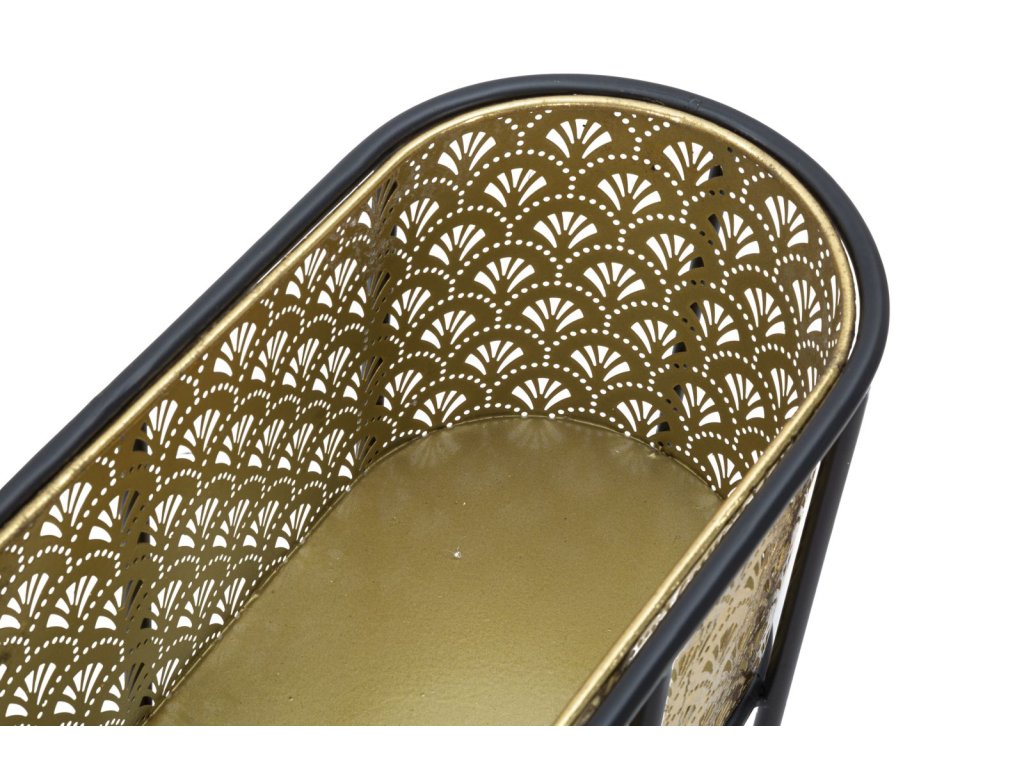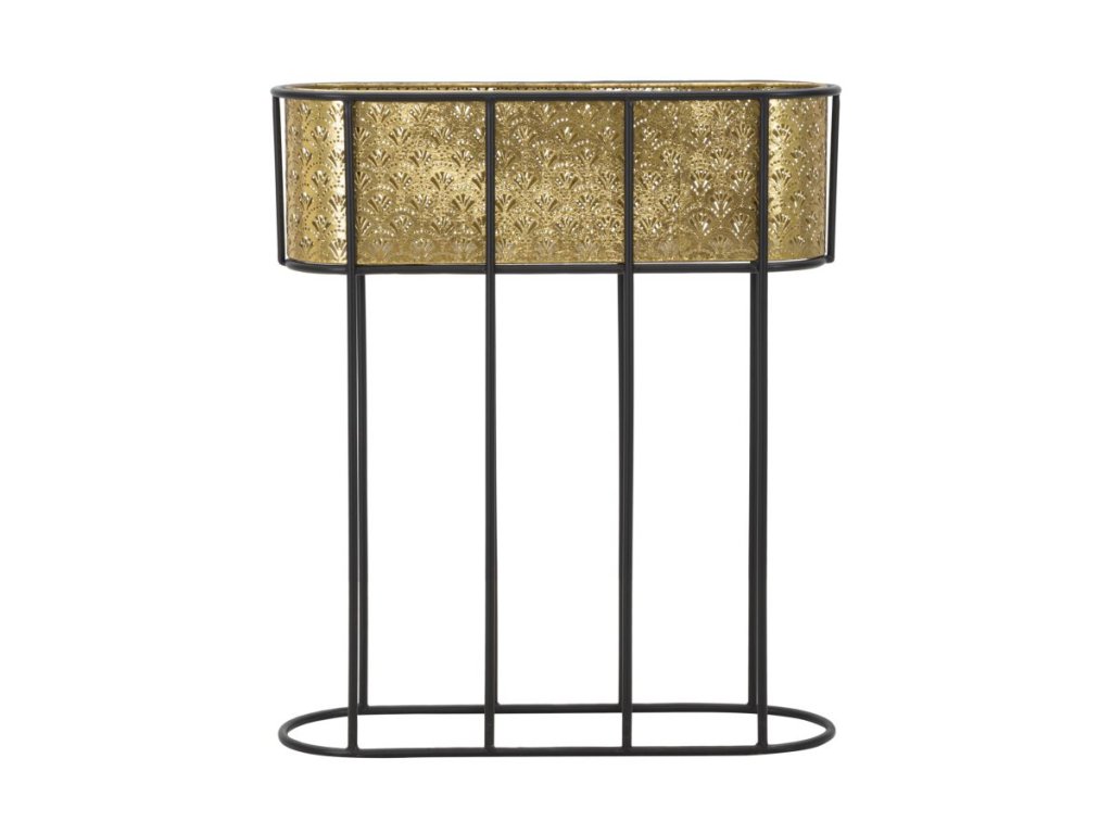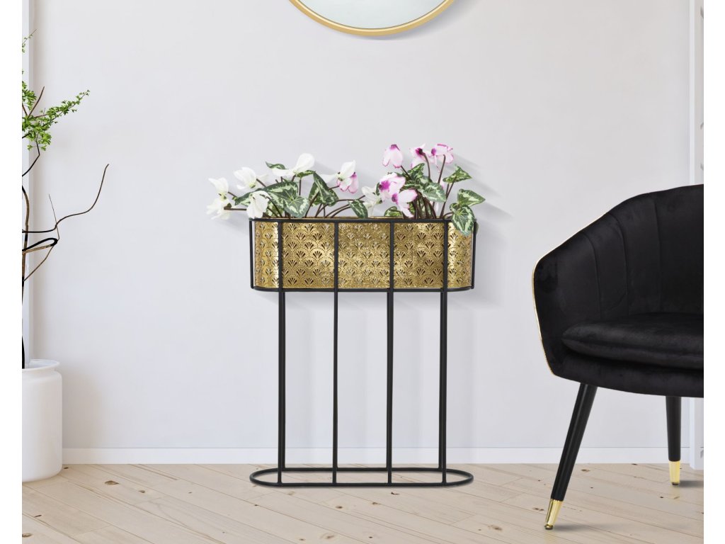 Oválny stojan na rastliny – luxusný oválny kvetináč zo zlatého kovu s jemnými vzormi.
