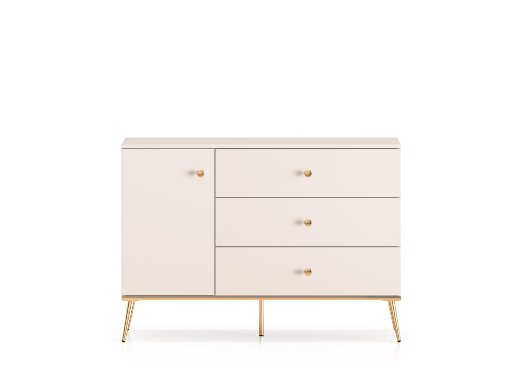 Široká horná doska ponúka priestor na vystavenie dekorácií, ako sú vázy, suveníry z ciest alebo obľúbené doplnky. Komoda stojí na vysokých kovových nožičkách, ktoré zabezpečujú stabilitu a zároveň uľahčujú upratovanie. Zlaté kovové úchytky a detaily dodávajú nábytku elegantný a luxusný vzhľad.