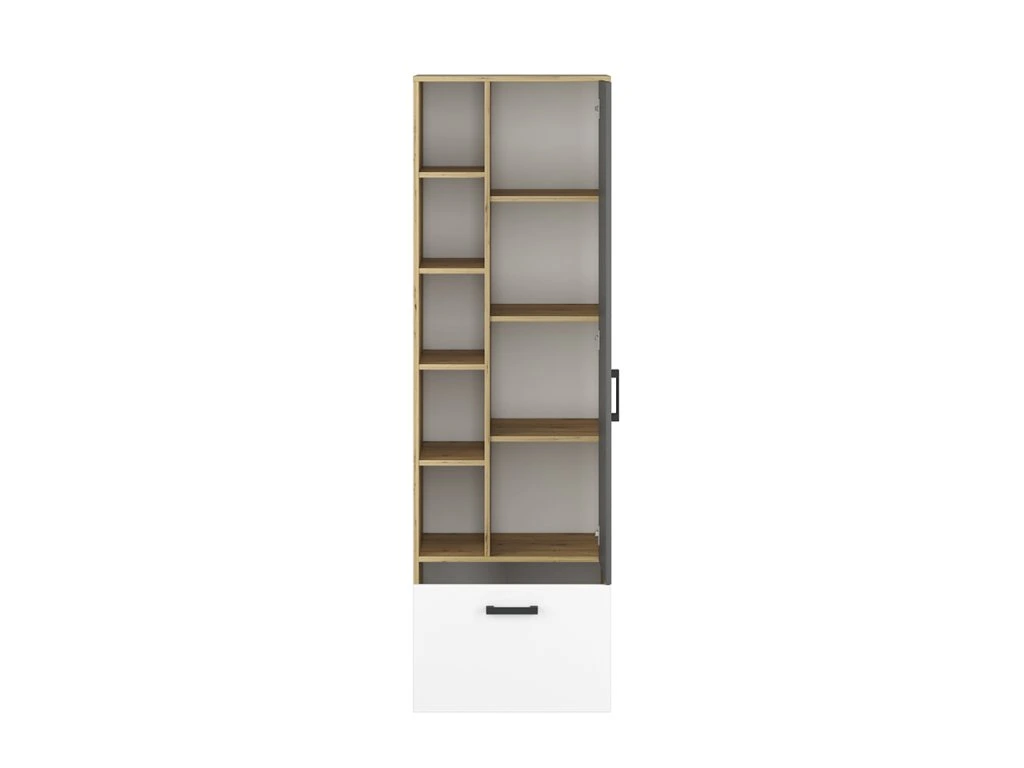 Regál Fini je moderný a praktický regál, ktorý ponúka ideálne riešenie pre uloženie kníh, školských potrieb aj dekorácií v detskej alebo študentskej izbe. Kombinácia bielej, antracitovej a dekoru dub artisan vytvára výrazný a štýlový kontrast, ktorý sa hodí do moderných interiérov.