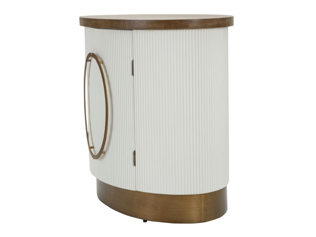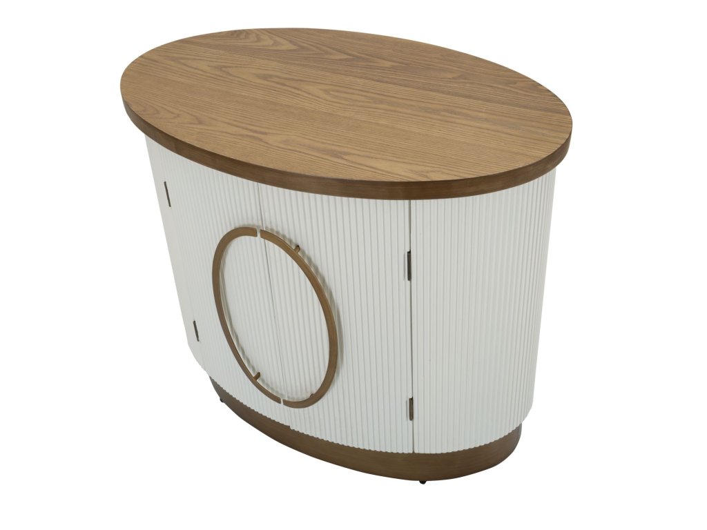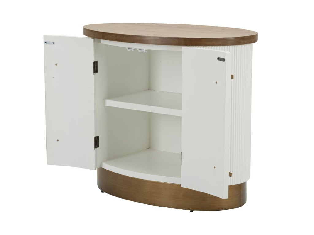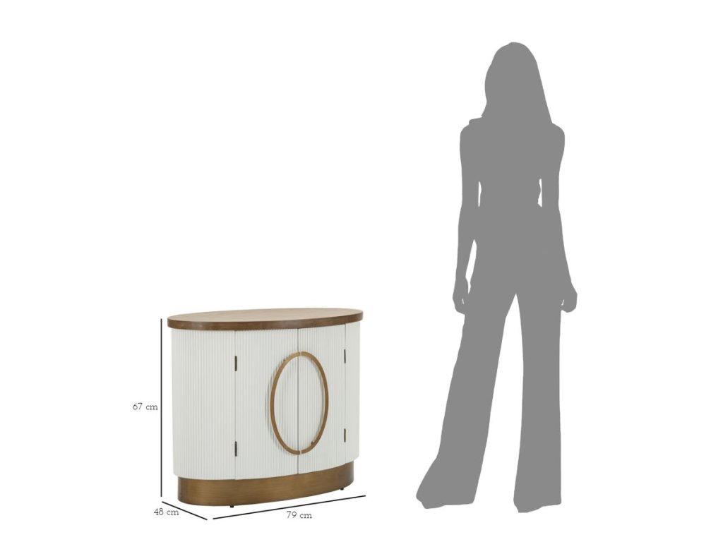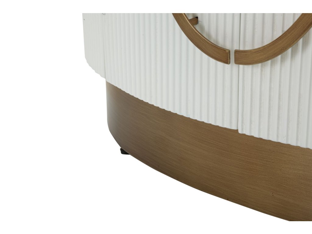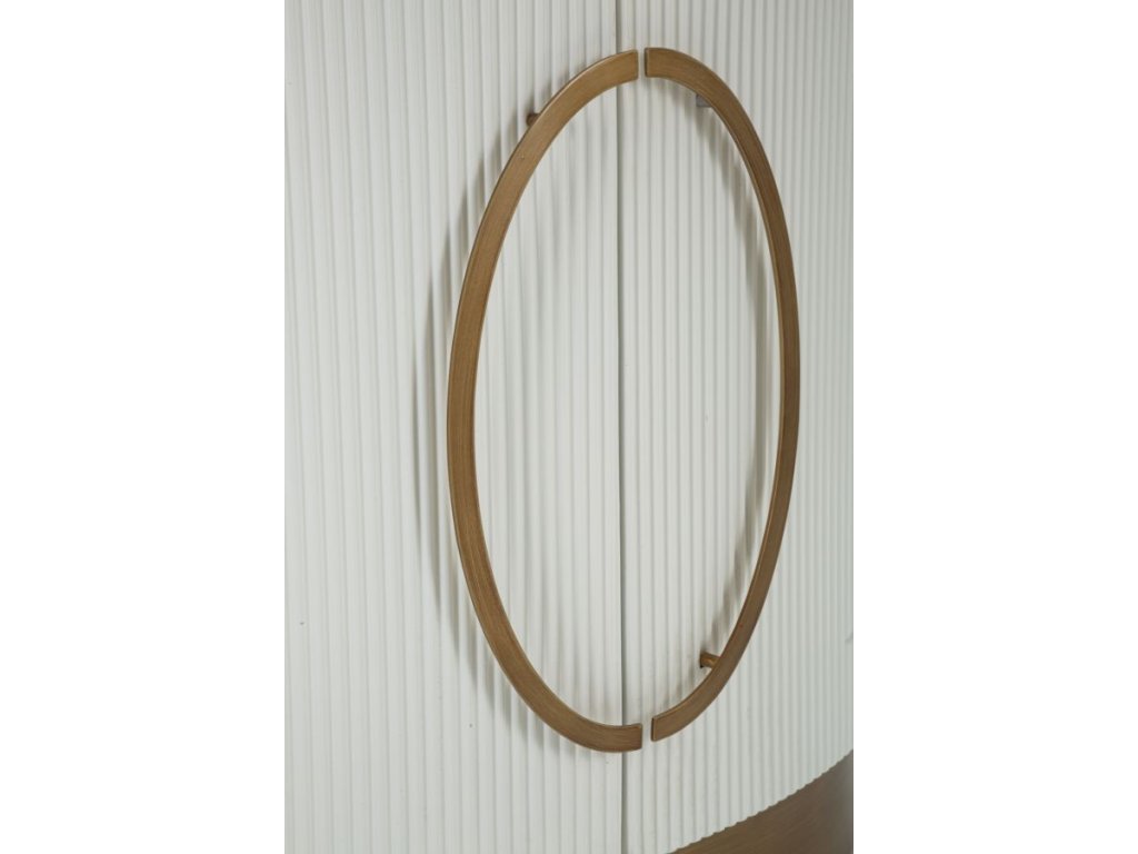 Dizajnová komoda TOLOSA je ideálnym riešením pre tých, ktorí hľadajú spojenie elegancie a praktického úložného priestoru. Jej oválny tvar s jemným ryhovaným povrchom a kontrastom bielej farby s prírodným dreveným dekorom pôsobí nadčasovo a luxusne.