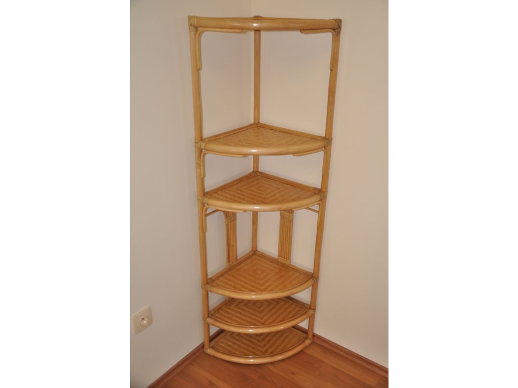 Ratanová rohová polica 6 poschodí medová – prírodný štýl a praktické riešenie.