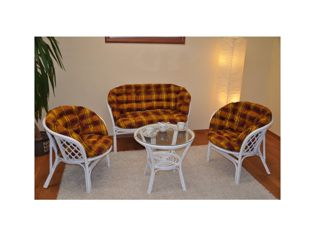 Štýlová ratanová sedacia súprava je vyrobená z prírodného ratanu s bielou konštrukciou. Súprava obsahuje lavicu, dve kreslá, stolík so sklenenou doskou a kompletnú sadu polstrov MAXI, ktoré zabezpečia pohodlné sedenie a elegantný vzhľad.