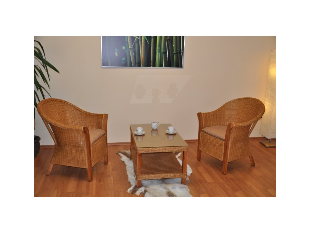 Ratanová sedacia súprava Carlot je luxusná zostava pozostávajúca z dvoch pohodlných kresiel s polstrami a stolíka so sklenenou doskou. Konštrukcia kombinuje prírodný ratan a teakového drevo, pričom medový výplet dodáva súprave elegantný a nadčasový vzhľad vhodný do obývacej izby, zimnej záhrady alebo na krytú terasu.