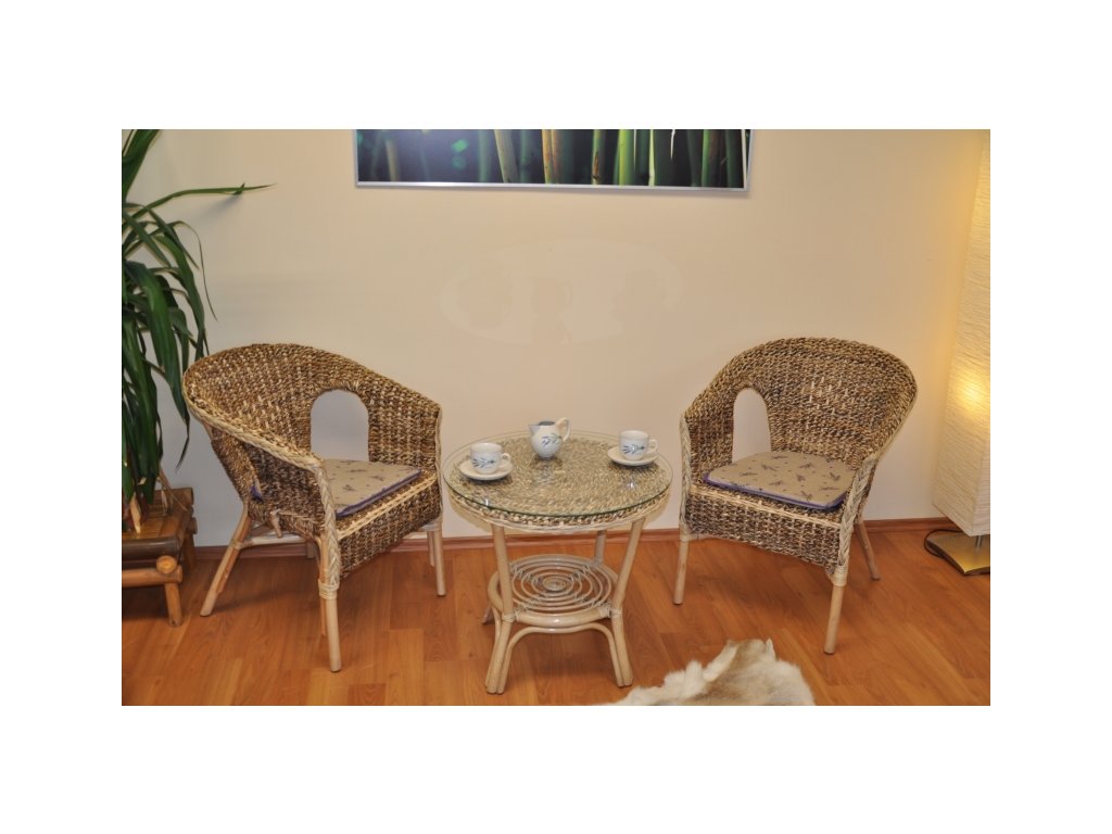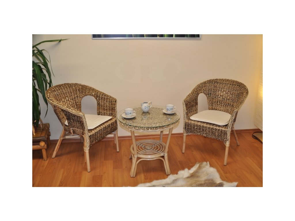 Ratanová sedacia súprava je vyrobená z prírodného masívneho ratanu s elegantným výpletom z listov banánovníku. Súprava sa skladá z dvoch kresiel s polstrami a stolíka so sklenenou doskou a vďaka kvalitnej skrutkovanej konštrukcii je pevná a stabilná.