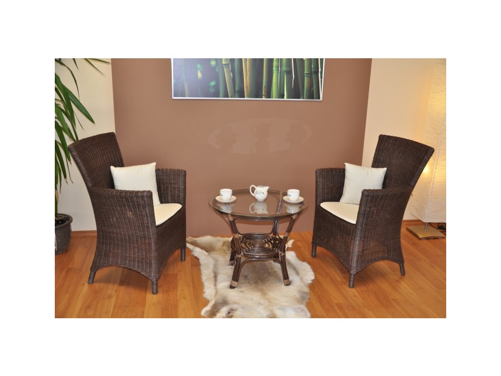Kreslá majú ergonomický tvar a nosnosť až 120 kg, zatiaľ čo stolík s priemerom 65 cm poskytuje dostatok priestoru pre odkladanie nápojov či dekorácií. Celá zostava spája pevnosť, kvalitu a nadčasový dizajn, ktorý sa hodí do moderných aj tradičných interiérov.