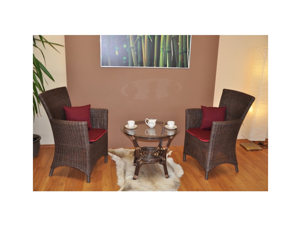 Ratanová sedacia súprava Pluto 2+1 sa skladá z dvoch pohodlných kresiel a stolíka so sklenenou doskou, vyrobených z prírodného ratanu s pevnou skrutkovanou konštrukciou. Polstre zaručujú komfortné sedenie a spolu s elegantným hnedom odtieňom ratanu vytvárajú útulnú a harmonickú atmosféru vhodnú do obývacej izby, zimnej záhrady alebo na krytú terasu.