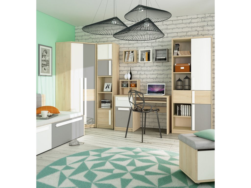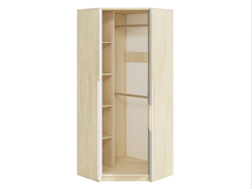 Rohové prevedenie umožňuje maximálne využiť priestor v miestnosti a zároveň poskytuje dostatok úložného miesta na oblečenie, doplnky aj školské potreby. Vnútorný priestor skrine je navrhnutý pre prehľadné usporiadanie – umožňuje kombinovať zavesené aj zložené oblečenie.
