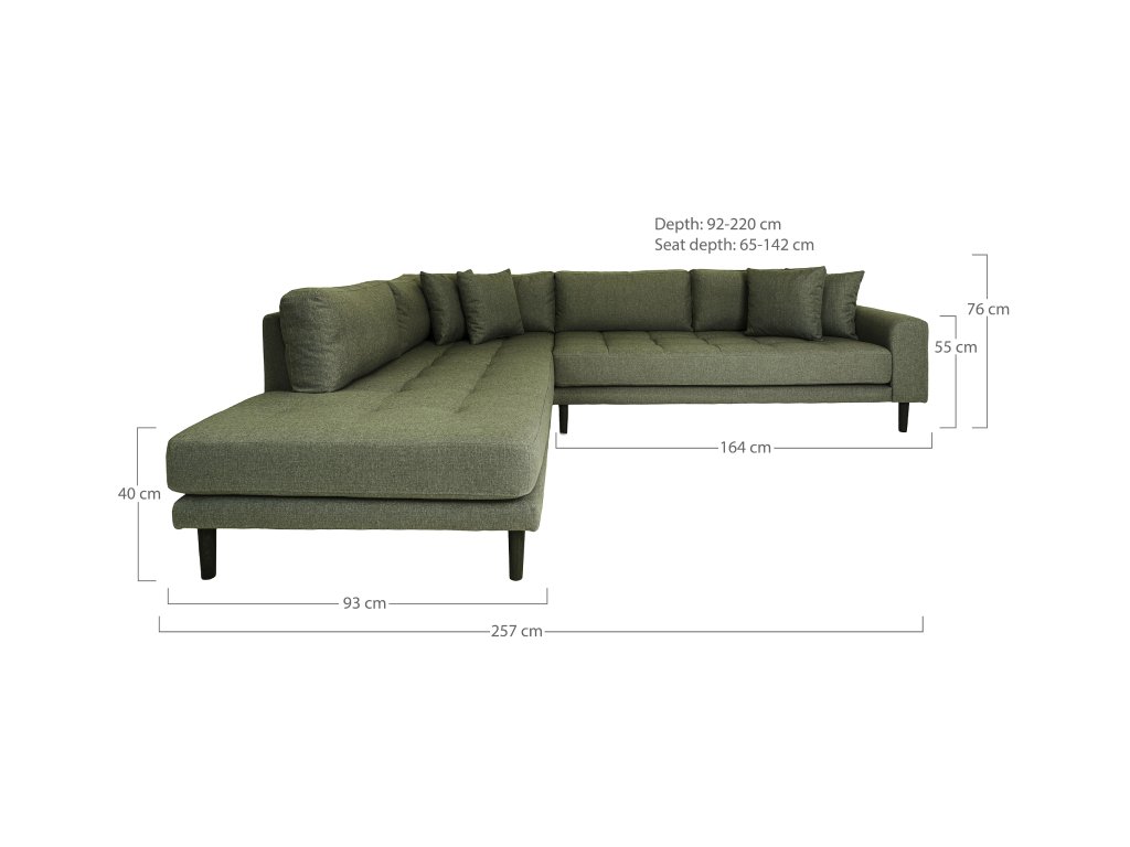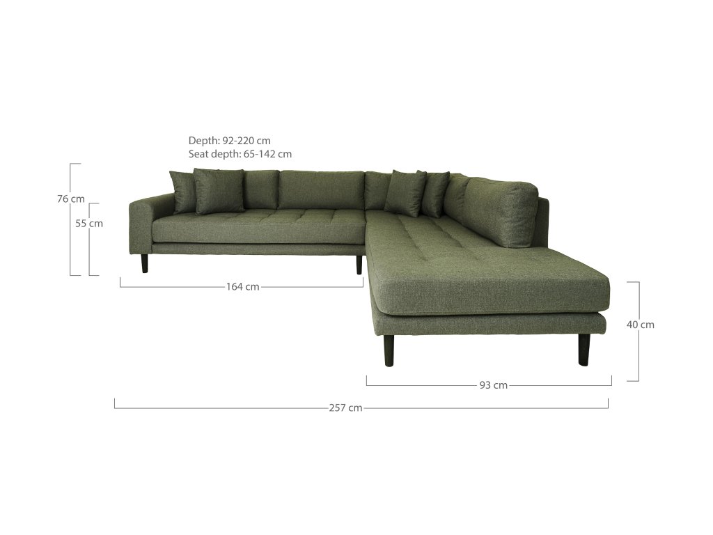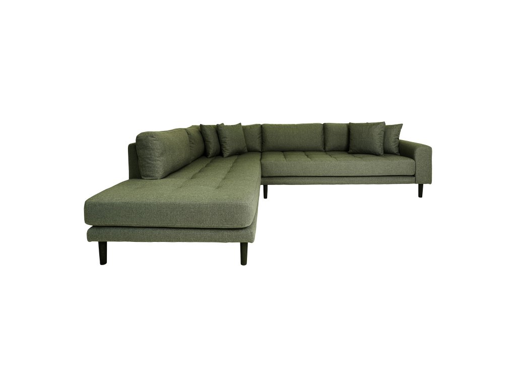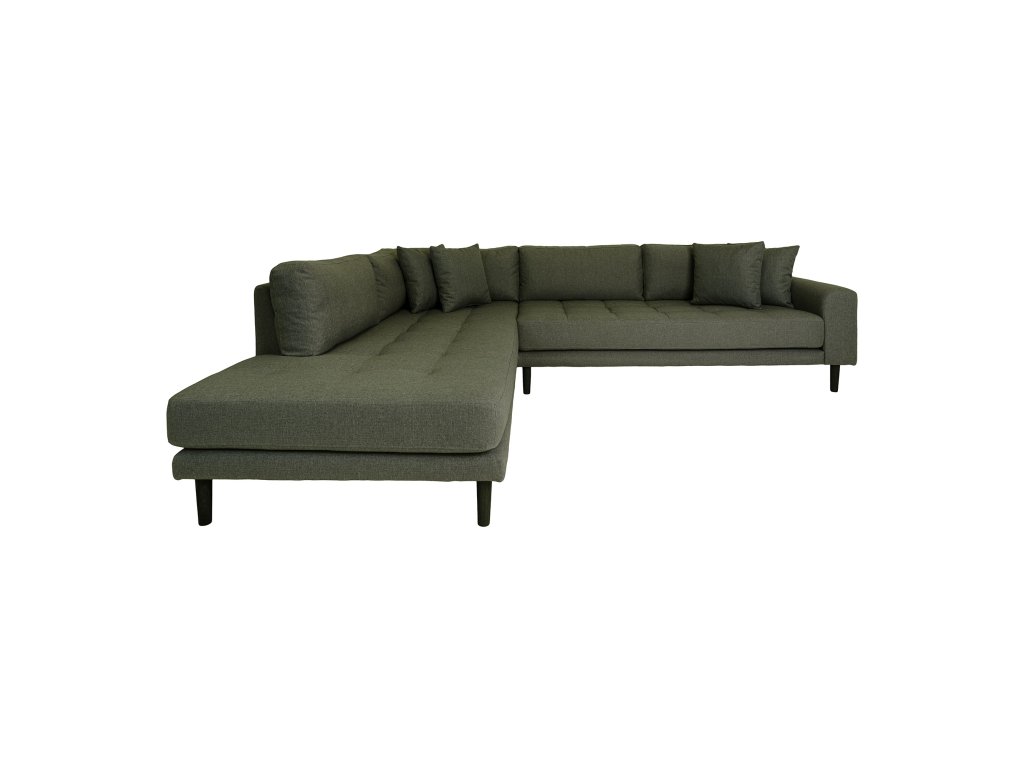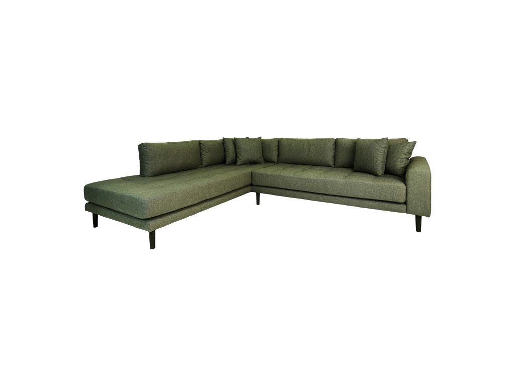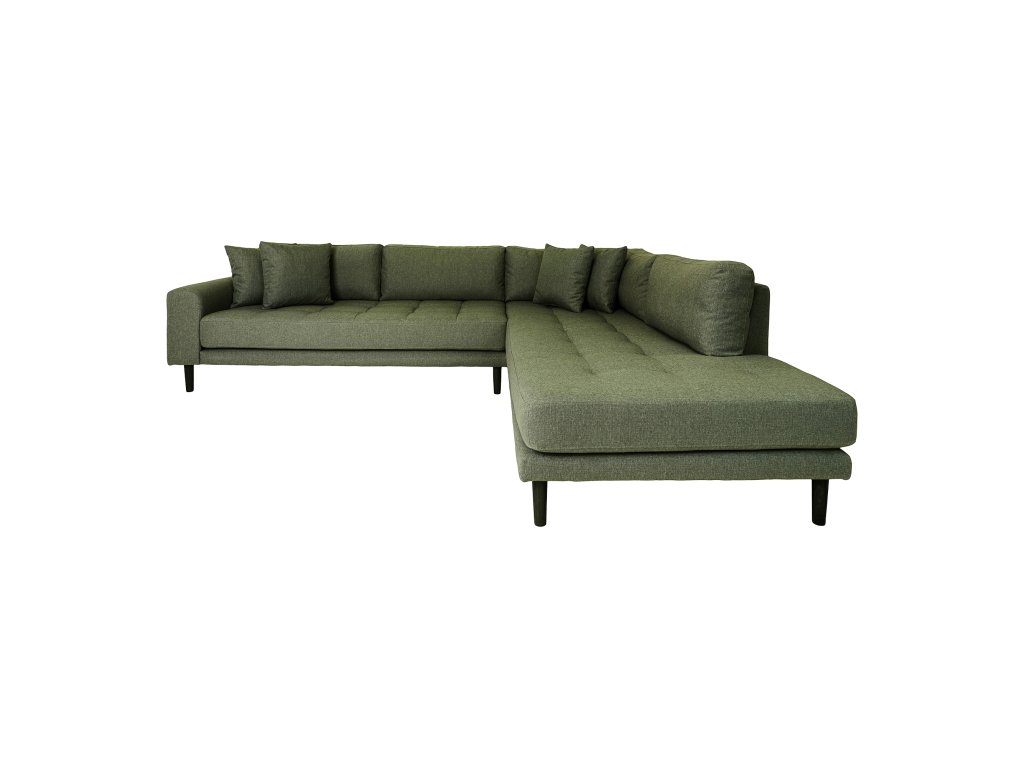 Olivovozelené čalúnenie doplnené o čierne drevené nohy vytvára zaujímavý kontrast a dodáva priestoru charakter. Otvorený koniec v pravostrannom alebo ľavostrannom prevedení poskytuje dostatok miesta na oddych aj pre viac osôb.