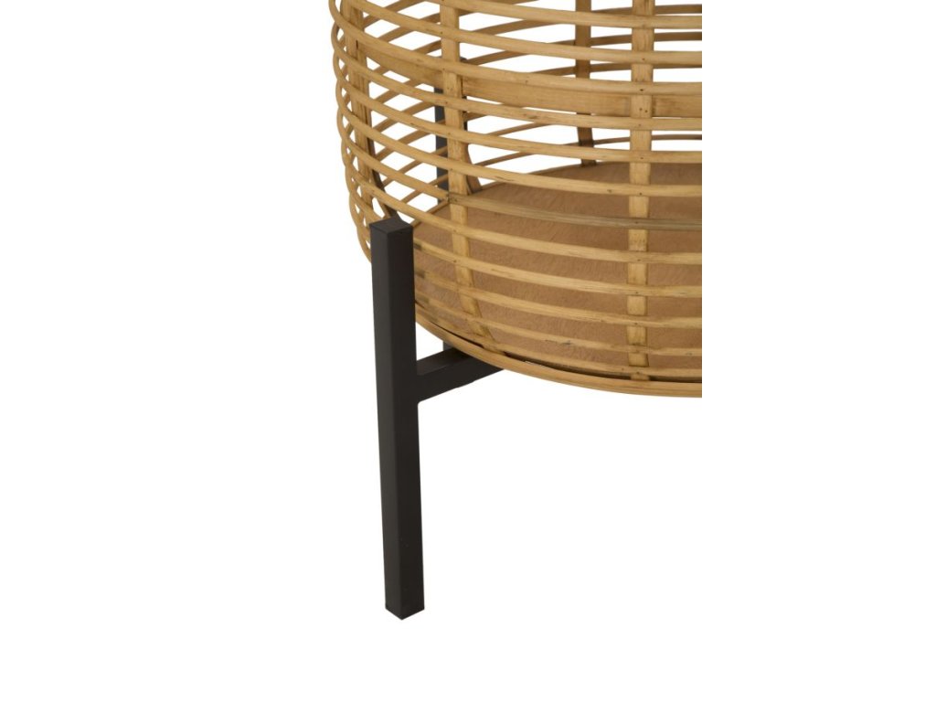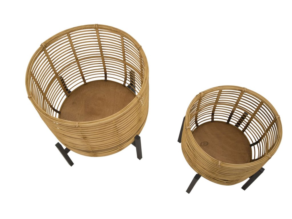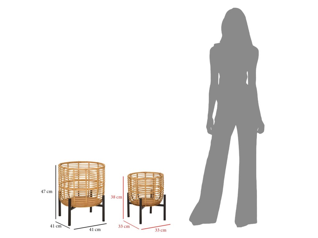 Táto sada pozostáva z dvoch stojanov s okrúhlymi ratanovými miskami umiestnenými na čiernom kovovom podstavci s jednoduchým a čistým dizajnom. Každý kus kombinuje klasický vzhľad ratanu s modernou líniou kovu, čím vytvára harmonický a štýlový prvok do každého priestoru. Ratanové misy sú odnímateľné, čo zaručuje flexibilitu a jednoduchú údržbu.