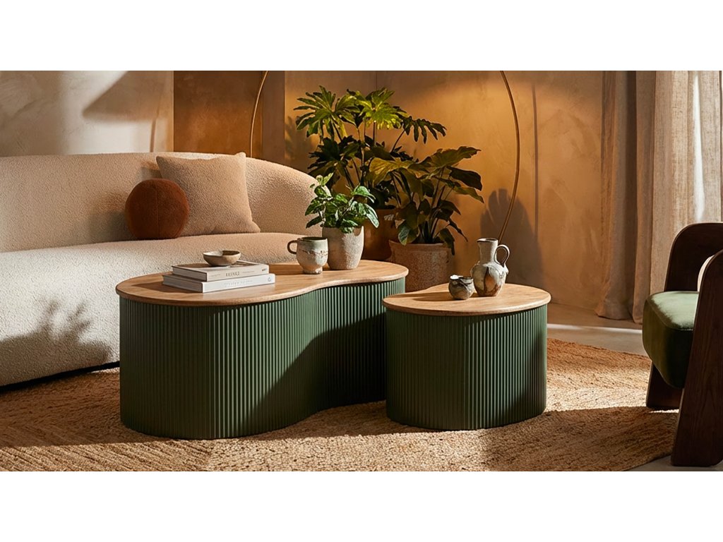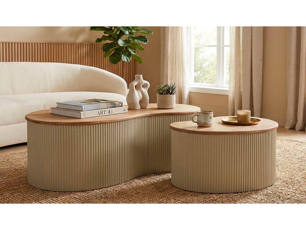 Stolíky sa skvele kombinujú s neutrálnym nábytkom – bielym, sivým alebo dreveným – a vyniknú v moderných, minimalistických či elegantne geometrických interiéroch. Organické línie a prírodné odtiene dreva vytvárajú príjemný kontrast k kovovým vrúbkovaným spodkom a dodávajú priestoru sofistikovaný charakter.