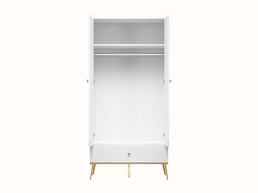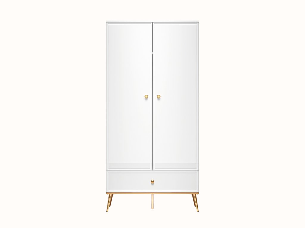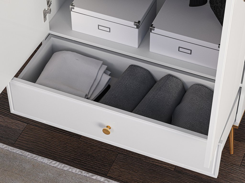 Šatníková skriňa z kolekcie Goldin ponúka ideálnu kombináciu elegancie, priestoru a praktického využitia. Vyznačuje sa moderným prevedením v kombinácii bieleho korpusu a lesklého MDF povrchu, ktorý dodáva nábytku exkluzívny vzhľad a zároveň opticky presvetľuje interiér.
