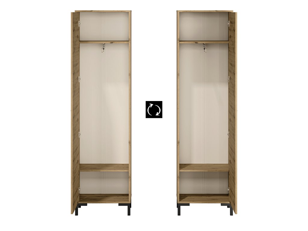 Šatníková skriňa z kolekcie Nevio kombinuje moderný dizajn s funkčnosťou, ktorá umožňuje efektívne usporiadanie oblečenia a doplnkov. Elegantný povrch v dekore Dąb Artisan dodáva nábytku prírodný a zároveň nadčasový vzhľad, ktorý harmonicky zapadne do spálne, predsiene alebo šatníka.