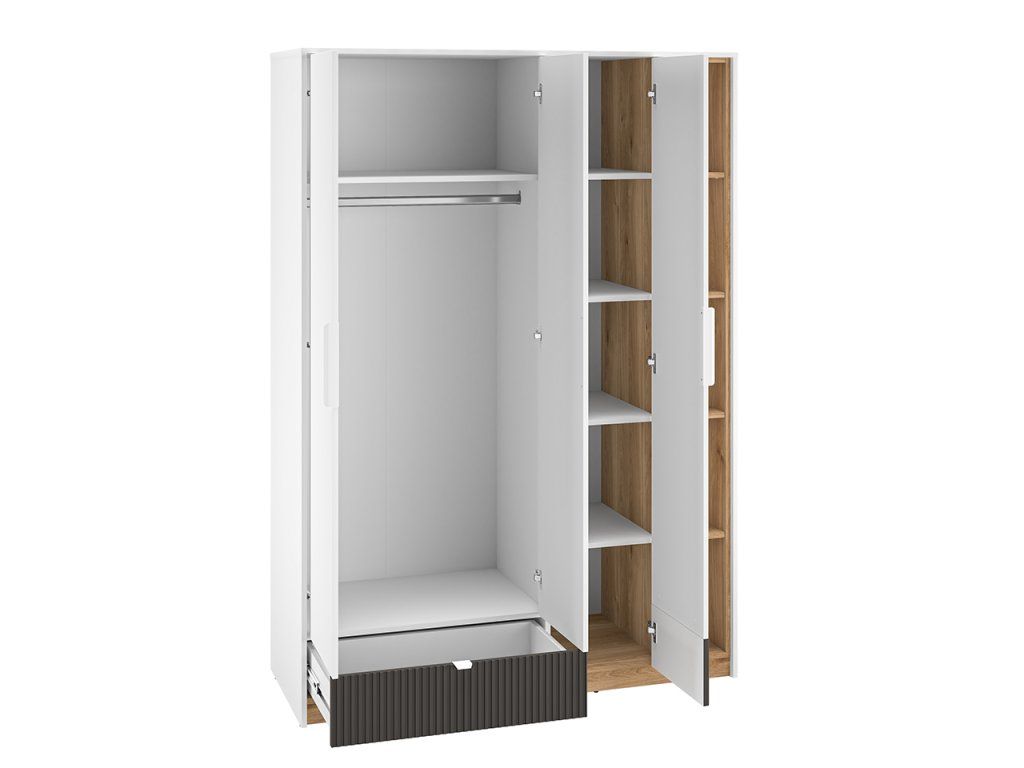 Šatníková skriňa z kolekcie Torino spája moderný dizajn s vysokou funkčnosťou. Kombinácia dekorov biela + MDF grafit mat a biela + dub Castello dodáva nábytku jedinečný a nadčasový vzhľad, ktorý vniesie do interiéru štýl a dynamiku.