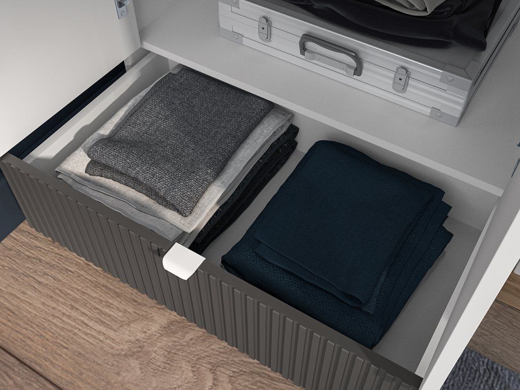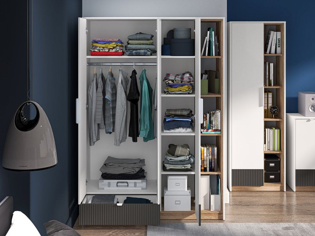 Šatník poskytuje dostatok miesta na uloženie oblečenia, doplnkov a sezónnych vecí. Praktické, minimalistické úchyty umožňujú jednoduchý prístup do vnútorných priestorov a zároveň dopĺňajú elegantný vzhľad nábytku.