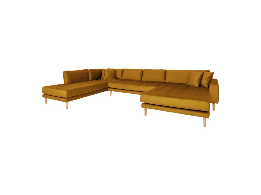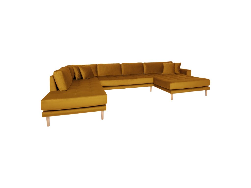 Sedacia súprava Lido do tvaru U s otvoreným koncom v horčicovožltom zamatovom čalúnení prináša pohodlie, moderný vzhľad a praktickosť. Ideálna do veľkých obývacích izieb, lounge zón alebo kancelárií, kde zaujme svojou farbou aj elegantným štýlom.