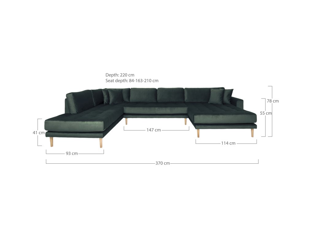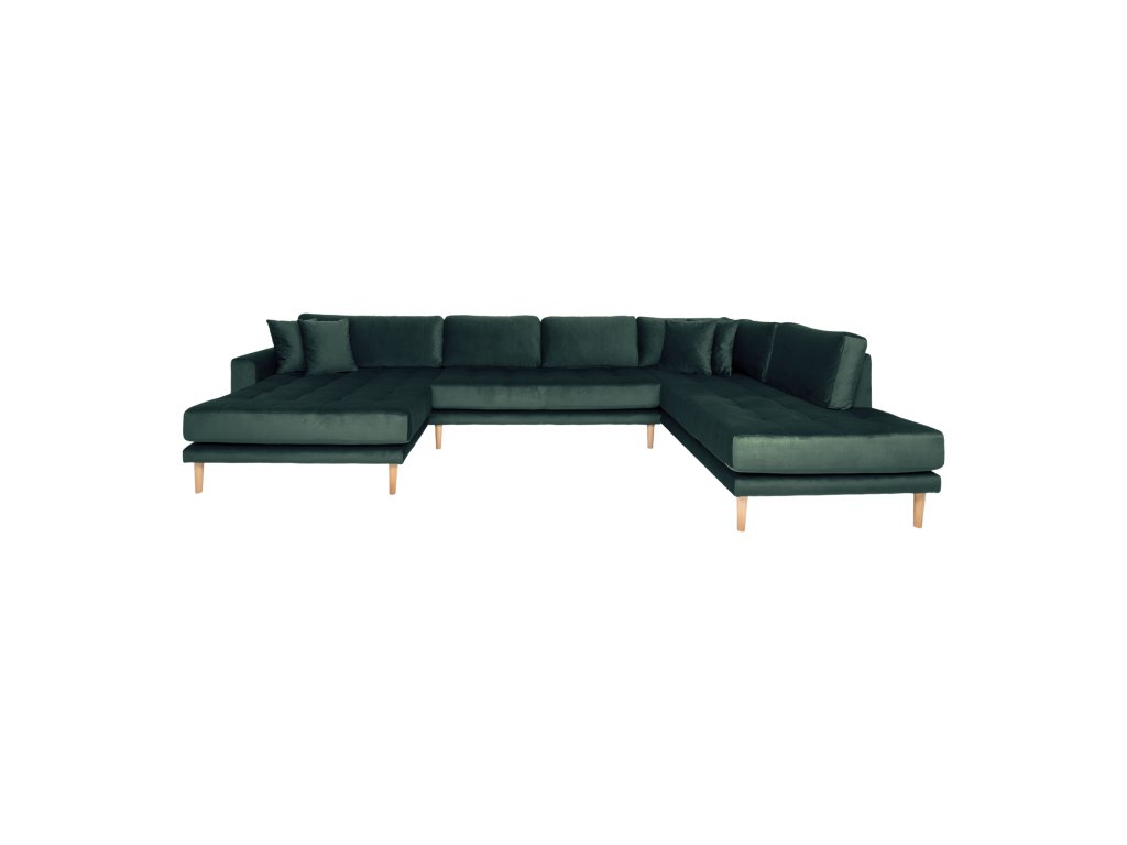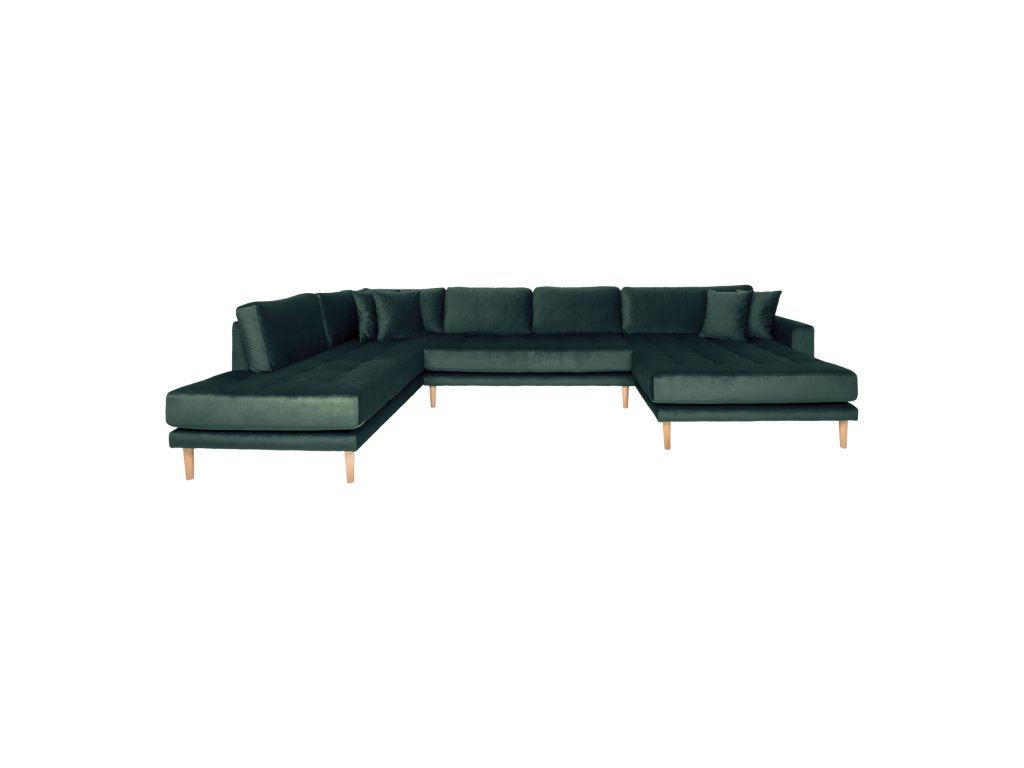 Sedacia súprava Lido do tvaru U s otvoreným koncom v tmavozelenom zamatovom čalúnení prináša moderný dizajn a maximálne pohodlie pre celú rodinu. Je ideálnou voľbou do priestranných obývacích izieb, spoločenských miestností či moderných lounge zón.