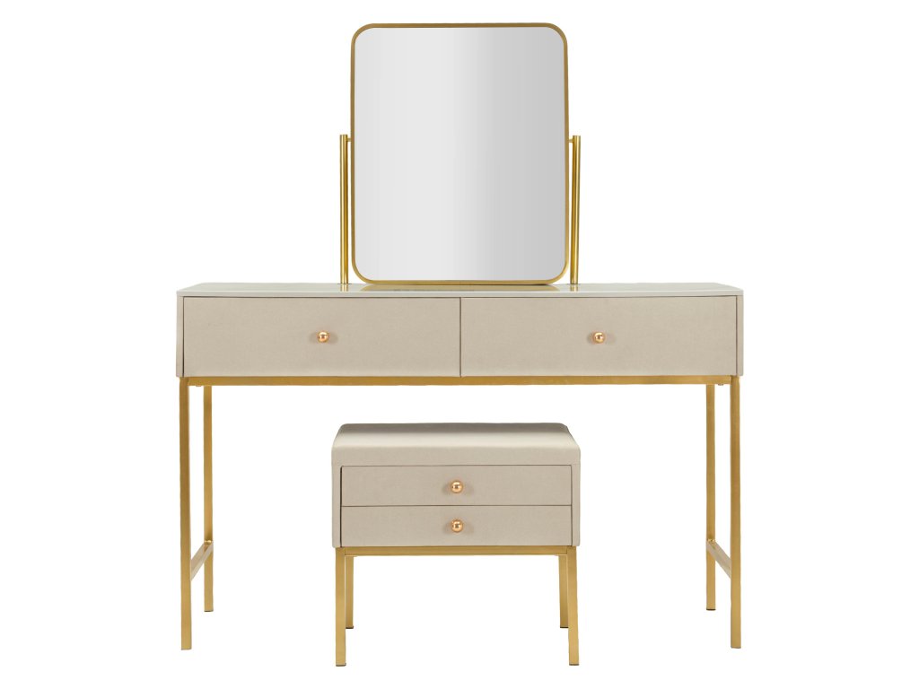 Dizajn stolíka predstavuje modernú interpretáciu klasického kozmetického stolíka. Kombinácia luxusných zlatých detailov, jemnej béžovej farby a elegantných materiálov vytvára sofistikovaný a nadčasový vzhľad, ktorý dodáva interiéru pocit elegancie a štýlu.