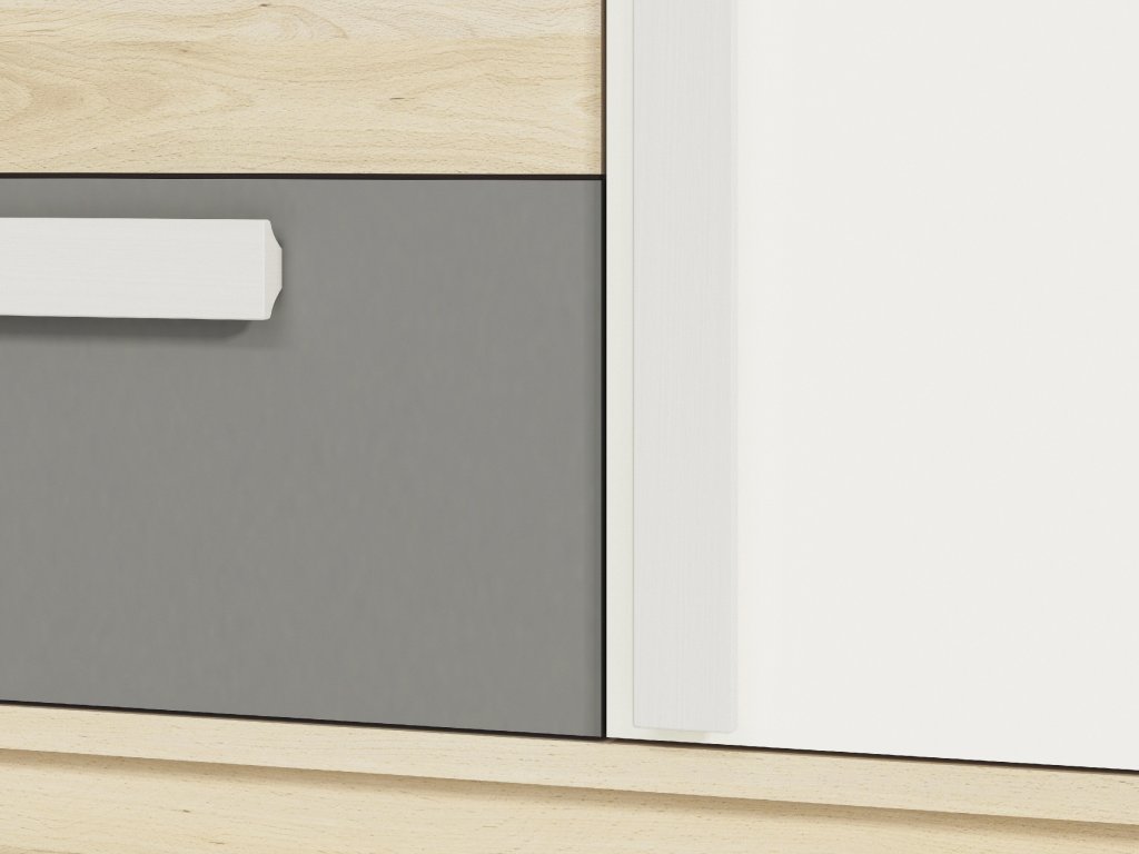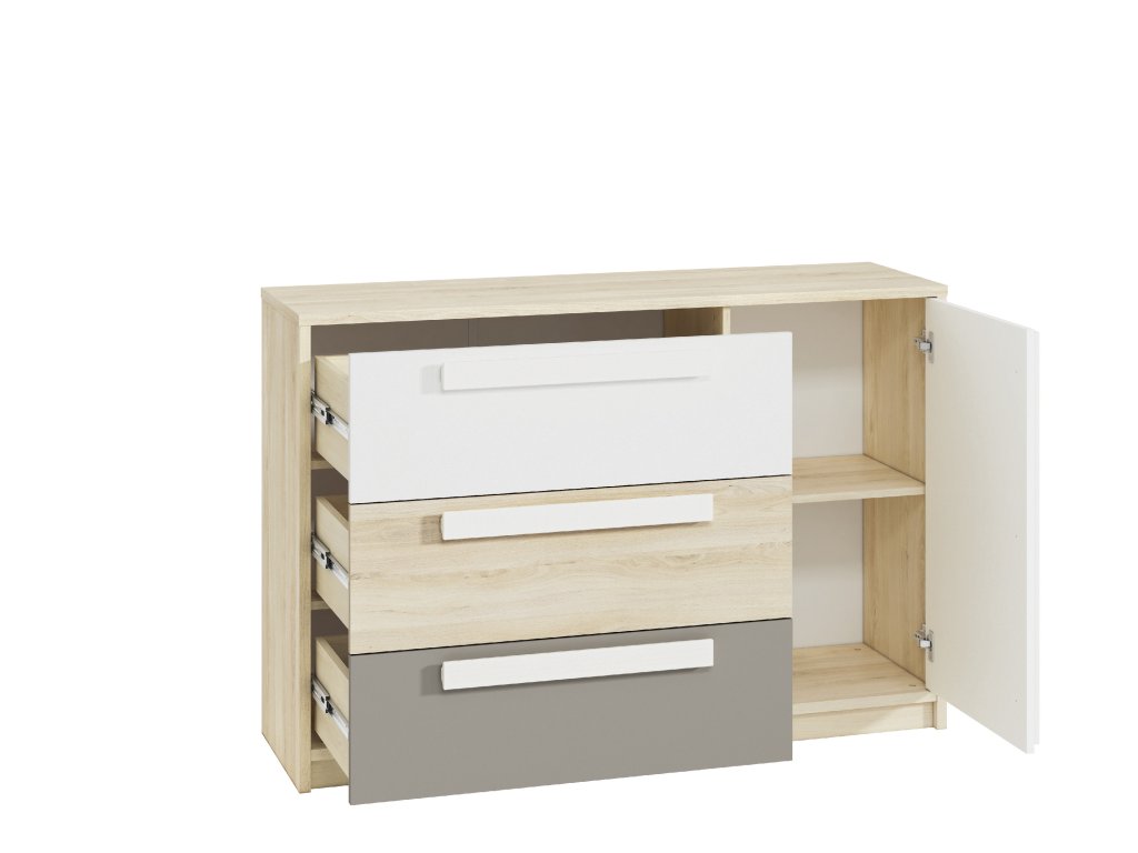 Komoda Drop je priestranná a moderná komoda, ktorá ponúka ideálne riešenie pre uloženie vecí v detskej alebo študentskej izbe. Kombinácia dekoru buk fjord, bielej a sivej farby pôsobí sviežo a nadčasovo, vďaka čomu sa hodí do izby pre deti aj tínedžerov.