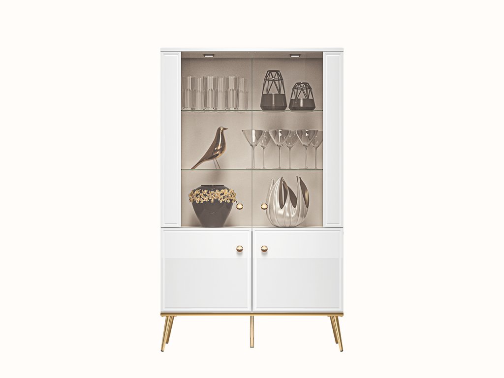 Vitrína z kolekcie Goldin je ideálnym riešením pre štýlové vystavenie vašich obľúbených dekorácií, skla či porcelánu. Kombinácia bieleho korpusu a lesklého MDF povrchu vnáša do interiéru svetlosť, eleganciu a nádych luxusu typický pre glamour štýl.