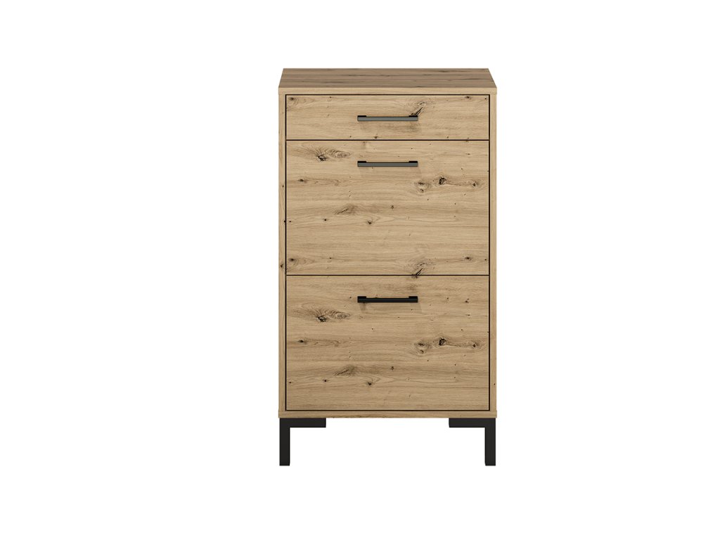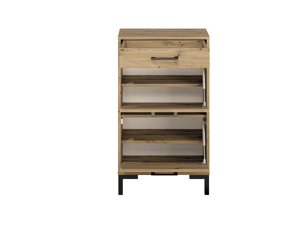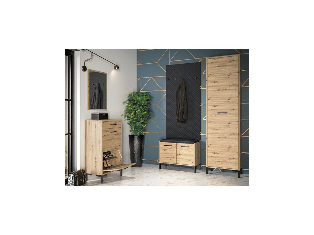 Skrinka na topánky z kolekcie Nevio kombinuje moderný dizajn s funkčnosťou, ktorá umožňuje udržať poriadok v predsieni. Elegantný dekor Dąb Artisan dodáva nábytku nadčasový vzhľad a príjemnú prírodnú atmosféru.