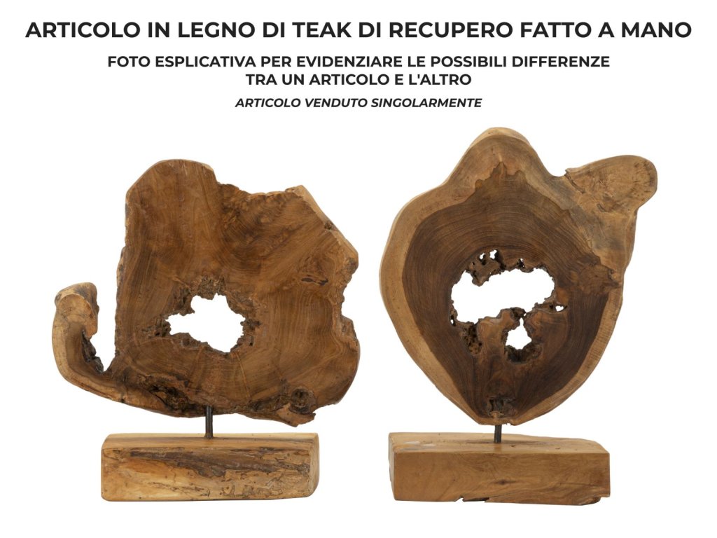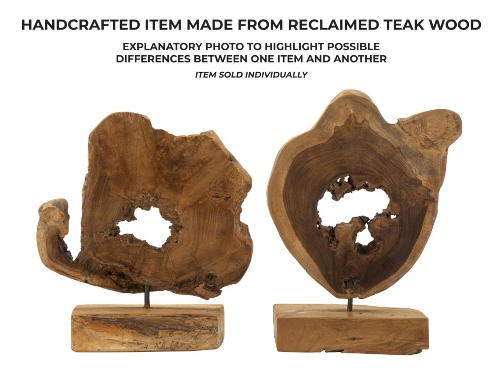 Každá socha vzniká ručným spracovaním recyklovaného teaku, vďaka čomu neexistujú dva rovnaké kusy.