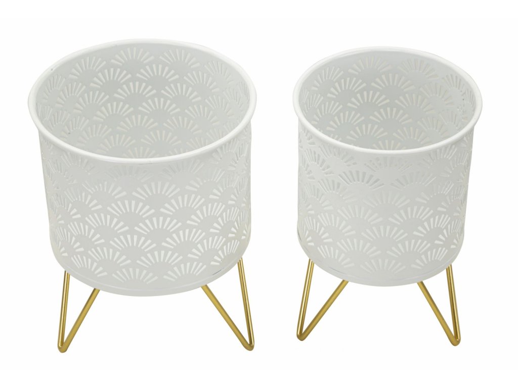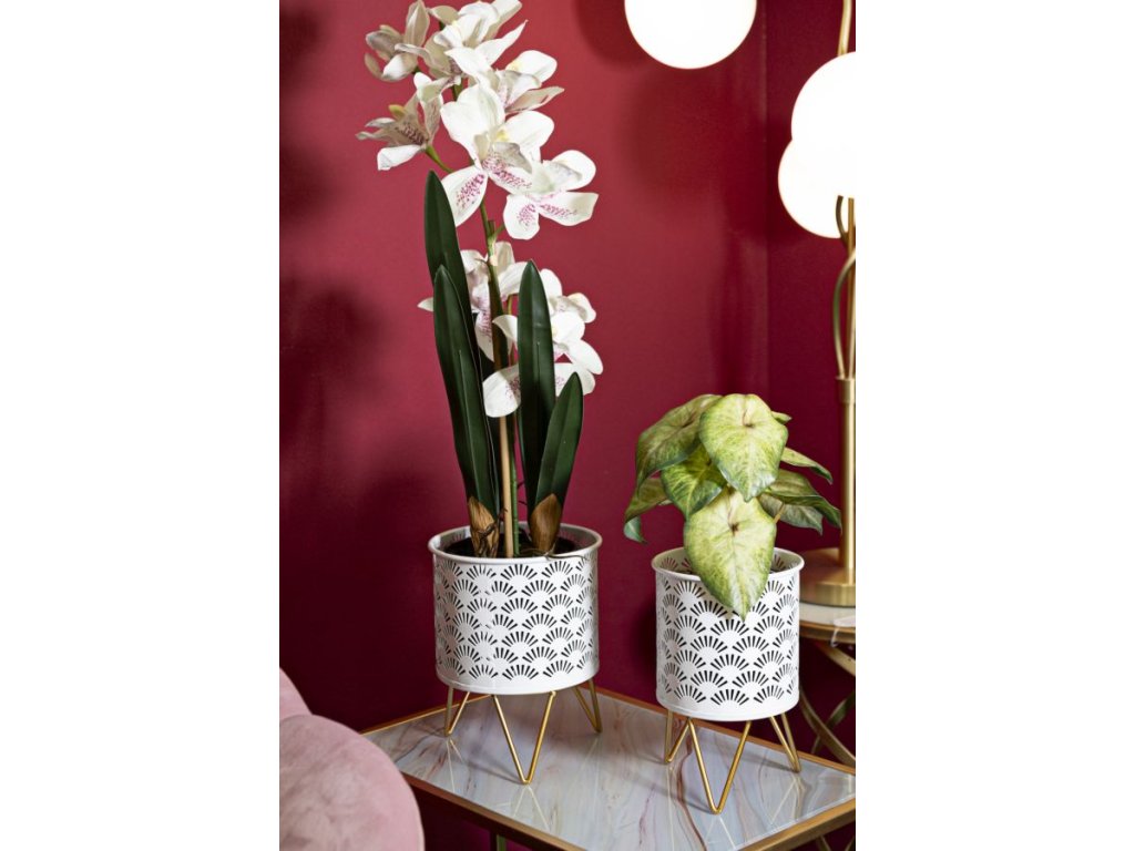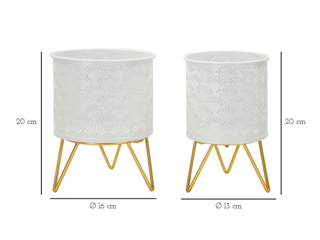Stojany na rastliny Carly prinášajú do interiéru eleganciu, moderný dizajn a vizuálnu ľahkosť. Biele kovové nádoby sú zdobené pravidelnými geometrickými výrezmi, ktoré vytvárajú zaujímavý efekt a umožňujú rastlinám ešte viac vyniknúť. Každá nádoba je uložená na stabilnom zlatom kovovom stojane, ktorý dodáva celku luxusný akcent a podčiarkuje celkovú harmóniu dekorácie.