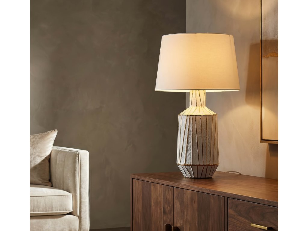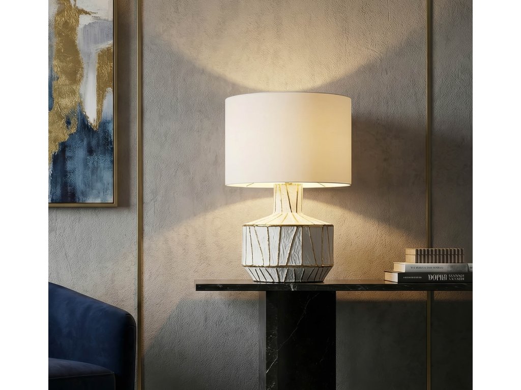 Biela keramická základňa je zdobená nepravidelnými jemnými zlatými čiarami, ktoré vytvárajú elegantný geometrický vzor a dodávajú lampe sofistikovaný charakter. Biele textilné tienidlo jemne rozptyľuje svetlo a vytvára príjemnú, teplú atmosféru v miestnosti.