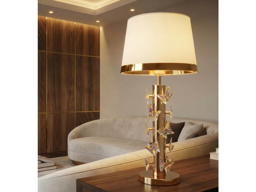 Dominantným prvkom lampy je zlatá kovová základňa doplnená dekoratívnymi motýľmi, ktoré vytvárajú originálny vizuálny efekt. Lesklé biele tienidlo so zlatým lemom jemne rozptyľuje svetlo a zvýrazňuje elegantný charakter lampy.