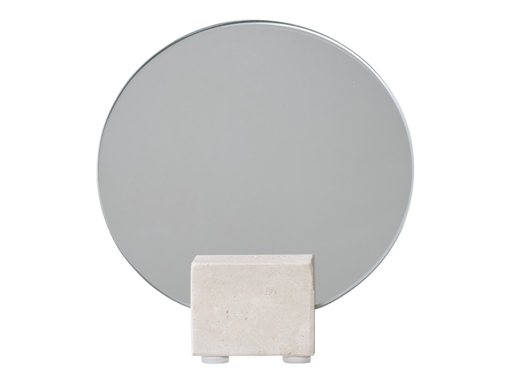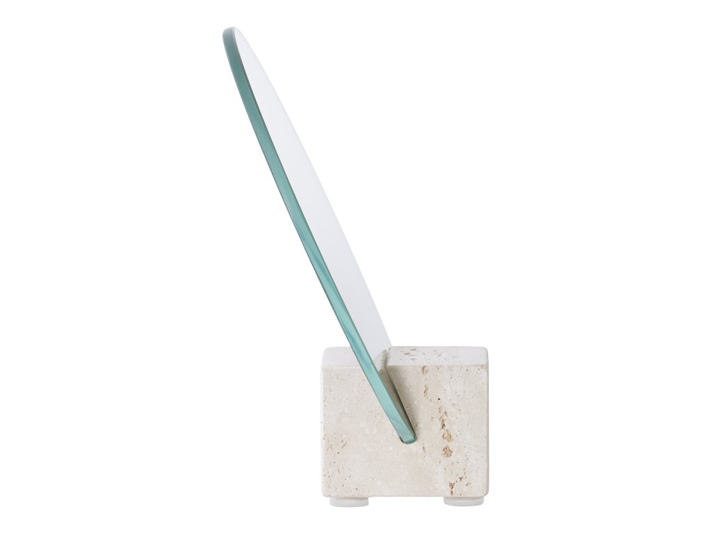Kombinácia skla a travertínu zaručuje stabilitu, odolnosť a dlhú životnosť. Okrúhly tvar pôsobí jemne a harmonicky, vďaka čomu sa moderné stolové zrkadlo ľahko začlení do rôznych štýlov interiéru – od minimalistického až po prírodný.