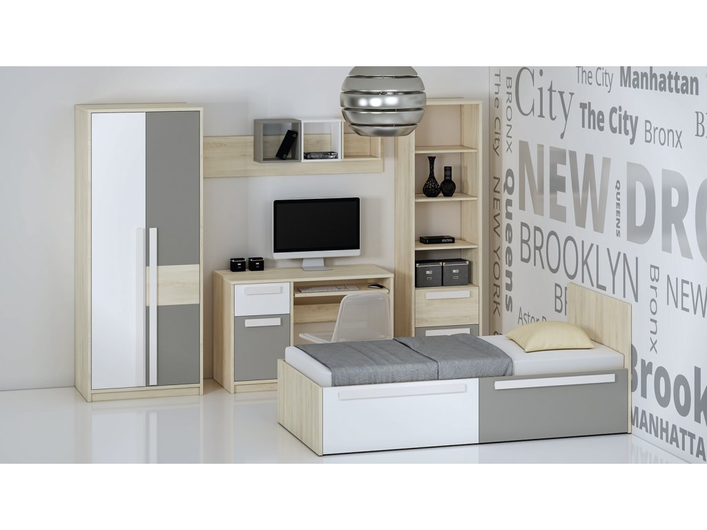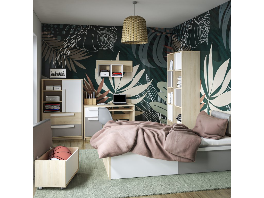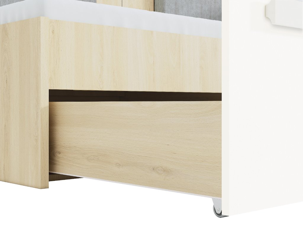 Posteľ Drop je moderná a praktická posteľ, ktorá vytvára ideálne miesto na odpočinok v detskej alebo študentskej izbe. Kombinácia dekoru buk fjord, bielej a sivej farby pôsobí sviežo a nadčasovo, vďaka čomu sa hodí do izby pre deti aj tínedžerov.