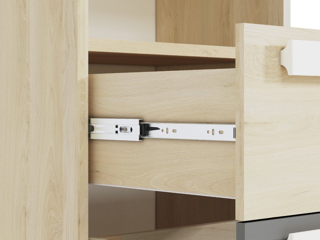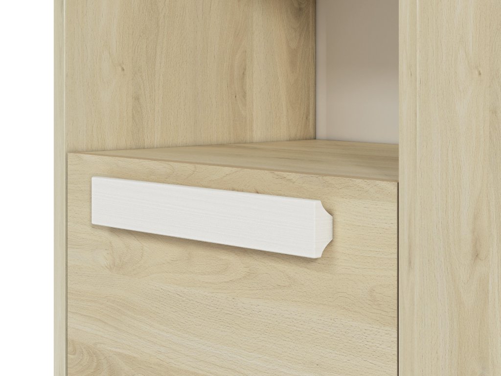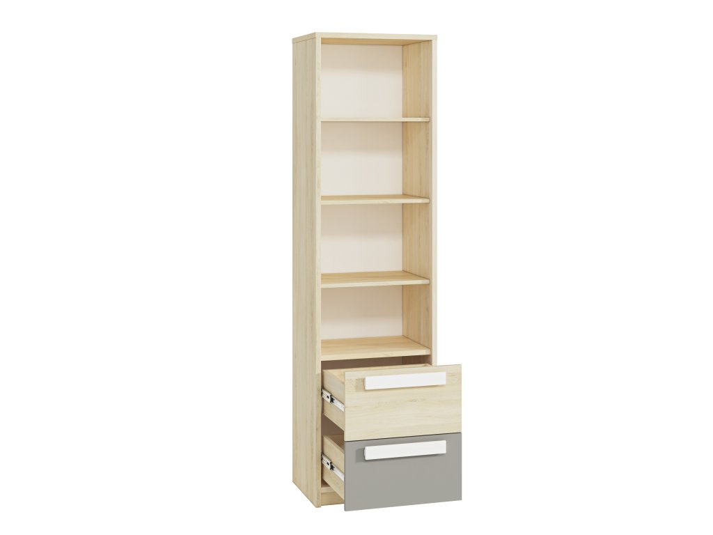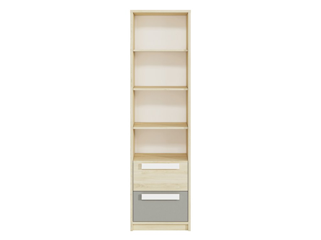 Regál Drop je praktický a moderný regál, ktorý ponúka ideálne riešenie pre uloženie kníh, školských potrieb aj dekorácií v detskej alebo študentskej izbe. Kombinácia dekoru buk fjord, bielej a sivej farby pôsobí sviežo a moderne, vďaka čomu sa hodí do izby pre deti aj tínedžerov.