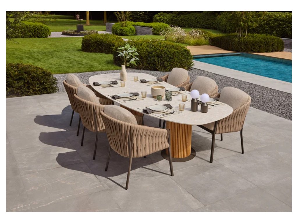 Stôl SUNS Omis Dropshape 280 × 130 cm predstavuje výnimočné spojenie moderného dizajnu, luxusných materiálov a vysokej odolnosti pre exteriérové priestory. Charakteristickým prvkom tejto verzie je dropshape tvar dosky, ktorý má organické, plynulé línie a jemne zaoblené konce. Vďaka tomu pôsobí stôl elegantne, mäkšie a takmer sochársky, čím vytvára výrazný dizajnový prvok na terase alebo v záhrade. (Dutch Garden)