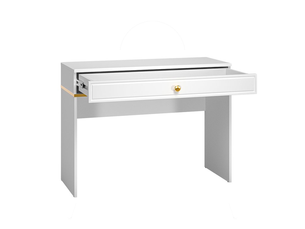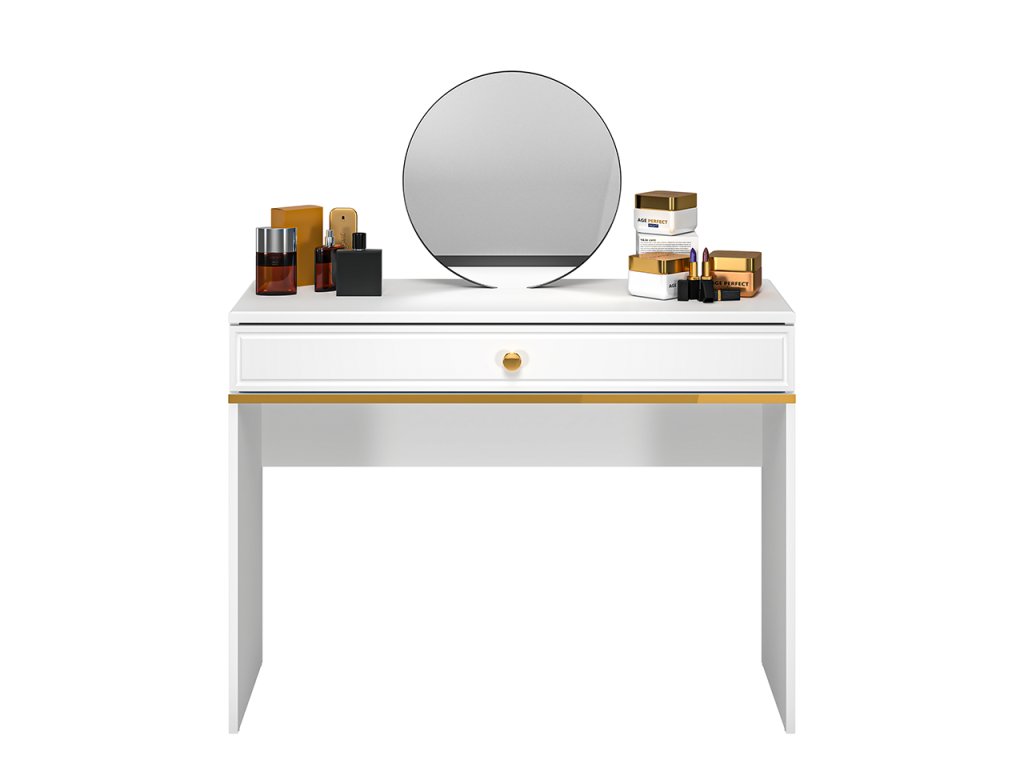 Toaletný stolík z kolekcie Goldin je dokonalým spojením luxusu, elegancie a praktickosti. Vyznačuje sa moderným prevedením v kombinácii bieleho korpusu a lesklého MDF povrchu, ktorý dodáva nábytku exkluzívny vzhľad a zároveň krásne presvetlí každý interiér.