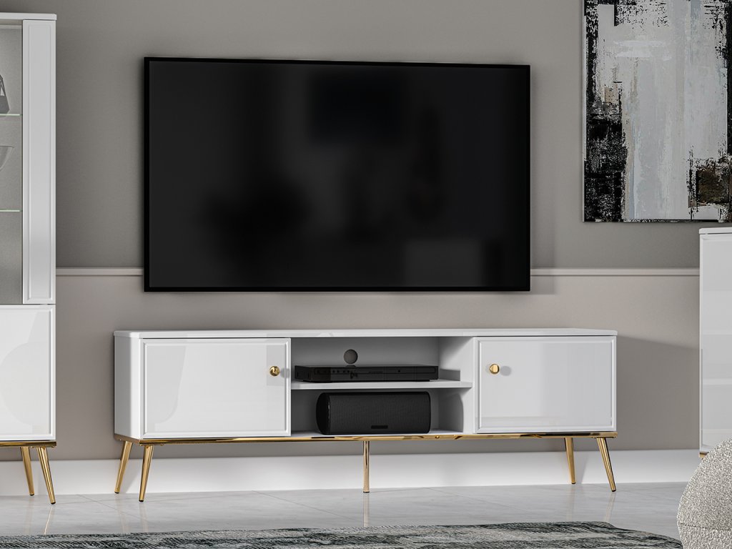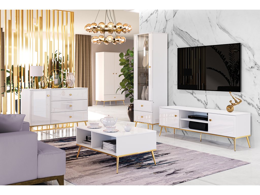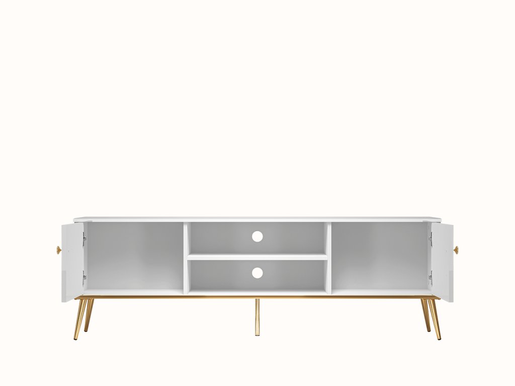 TV skrinka z kolekcie Goldin predstavuje ideálne spojenie funkčnosti a luxusného glamour dizajnu. Kombinácia bieleho korpusu a lesklého MDF povrchu dodáva nábytku sofistikovaný vzhľad, ktorý krásne rozjasní priestor a dodá mu moderný charakter.