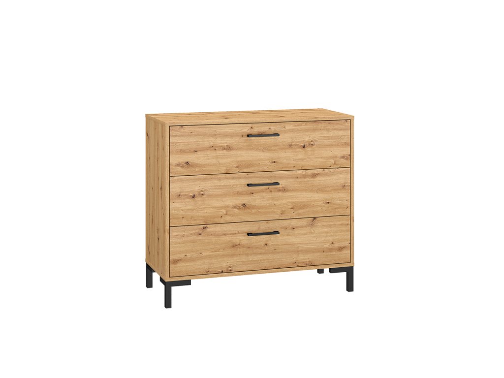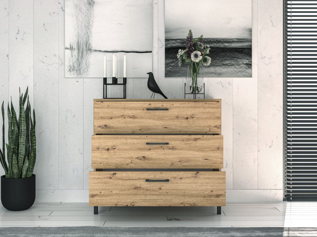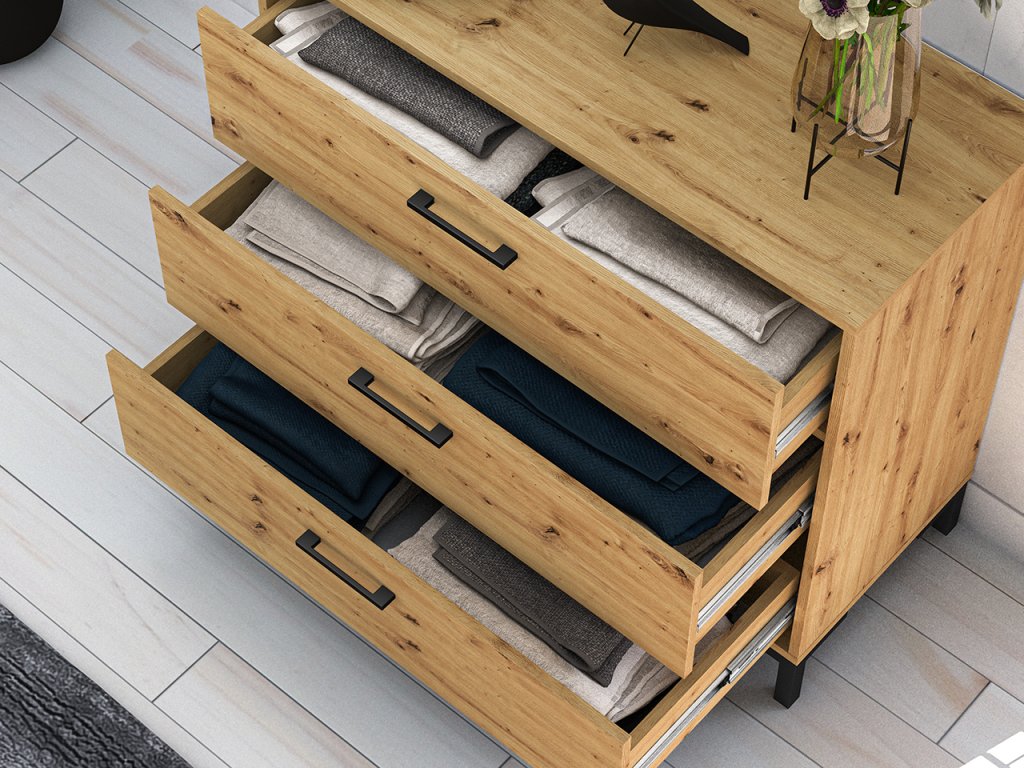 Komoda z kolekcie Nevio spája moderný dizajn s funkčnosťou, ktorá zabezpečí prehľadné usporiadanie vecí v domácnosti. Elegantný dekor Dąb Artisan dodáva nábytku prírodný a nadčasový vzhľad, ktorý ľahko zapadne do rôznych interiérov.