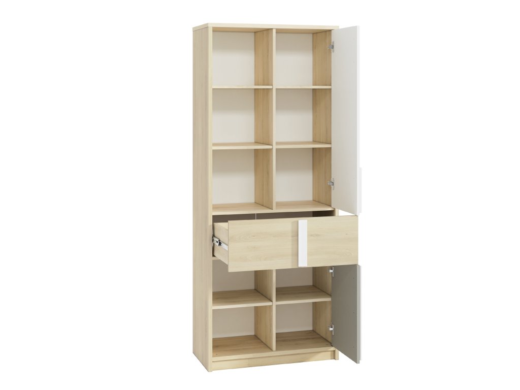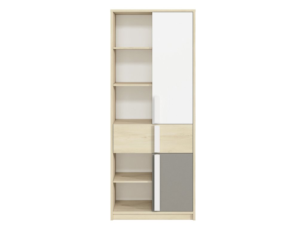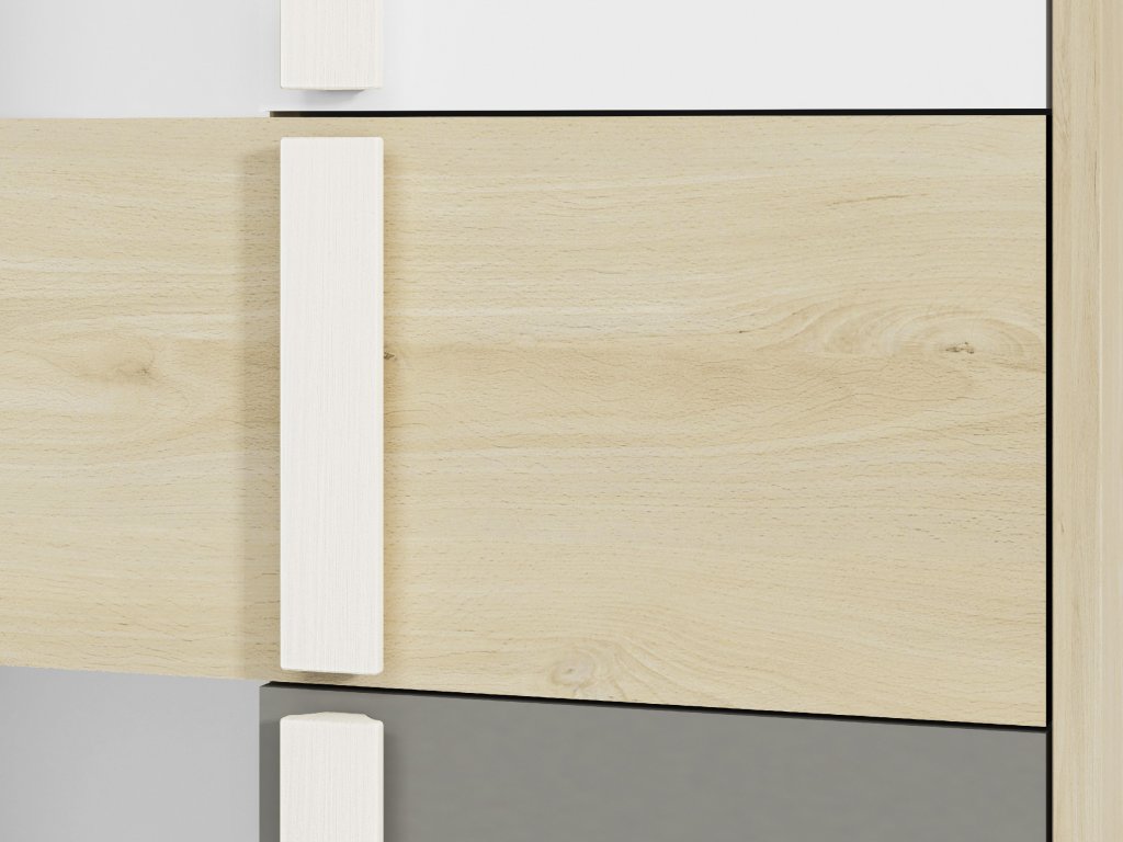 Skriňa Drop je praktická úzka dvojdverová skriňa, ktorá je ideálnym riešením do menších detských alebo študentských izieb. Kombinácia dekoru buk fjord, bielej a sivej farby pôsobí moderne a sviežo, vďaka čomu sa hodí do izby pre deti aj tínedžerov.