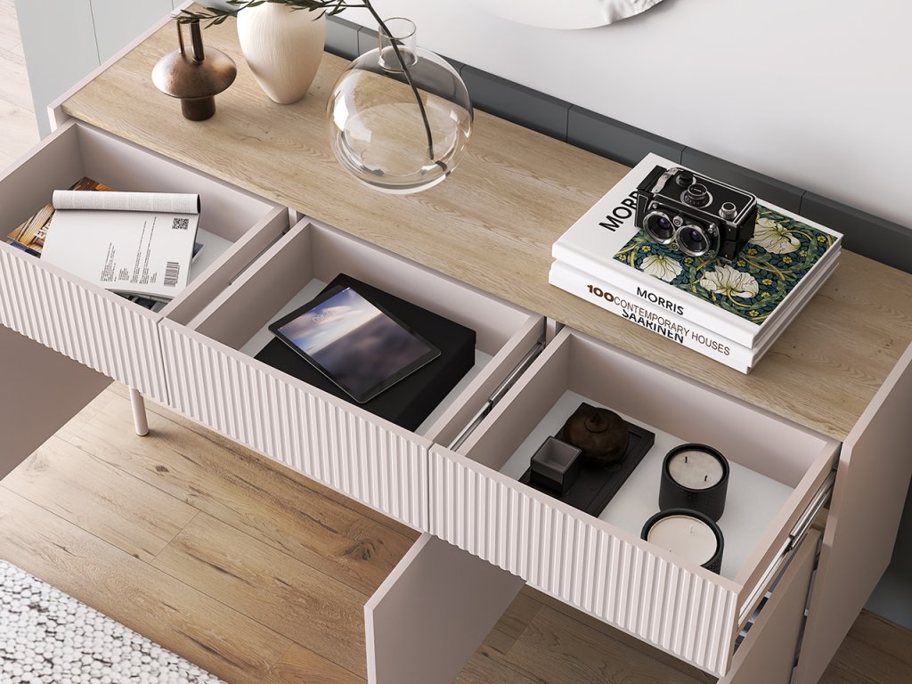 Komoda Dunea spája funkčnosť s elegantným vzhľadom. Stabilitu zabezpečujú odolné kovové nožičky a komfort pri používaní dopĺňajú zásuvky s plným výsuvom a pánty s tichým dovieraním.