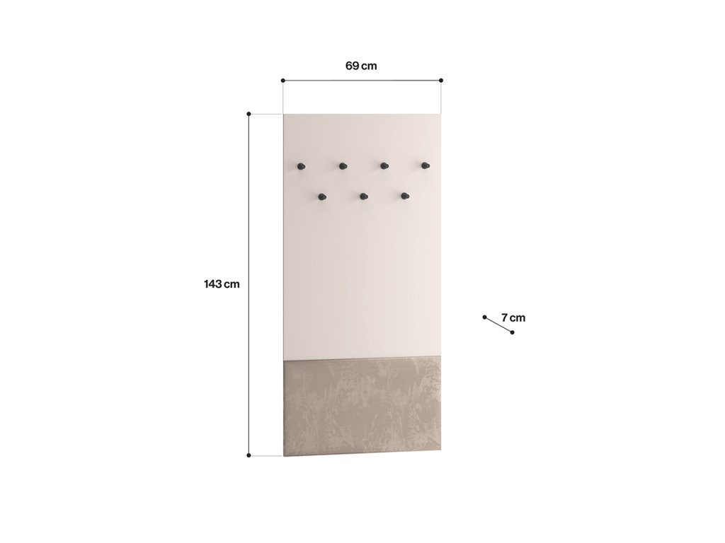 Dolná časť je čalúnená mäkkým velúrom, ktorý slúži ako praktické operadlo. Béžový odtieň čalúnenia spolu s jemným tónom Cashmere pôsobí elegantne, útulne a dodá predsieni pocit tepla. Vešiak navyše dokonale ladí s botníkmi z kolekcie Voco, takže si môžete vytvoriť jednotný a harmonický predsieňový komplet.