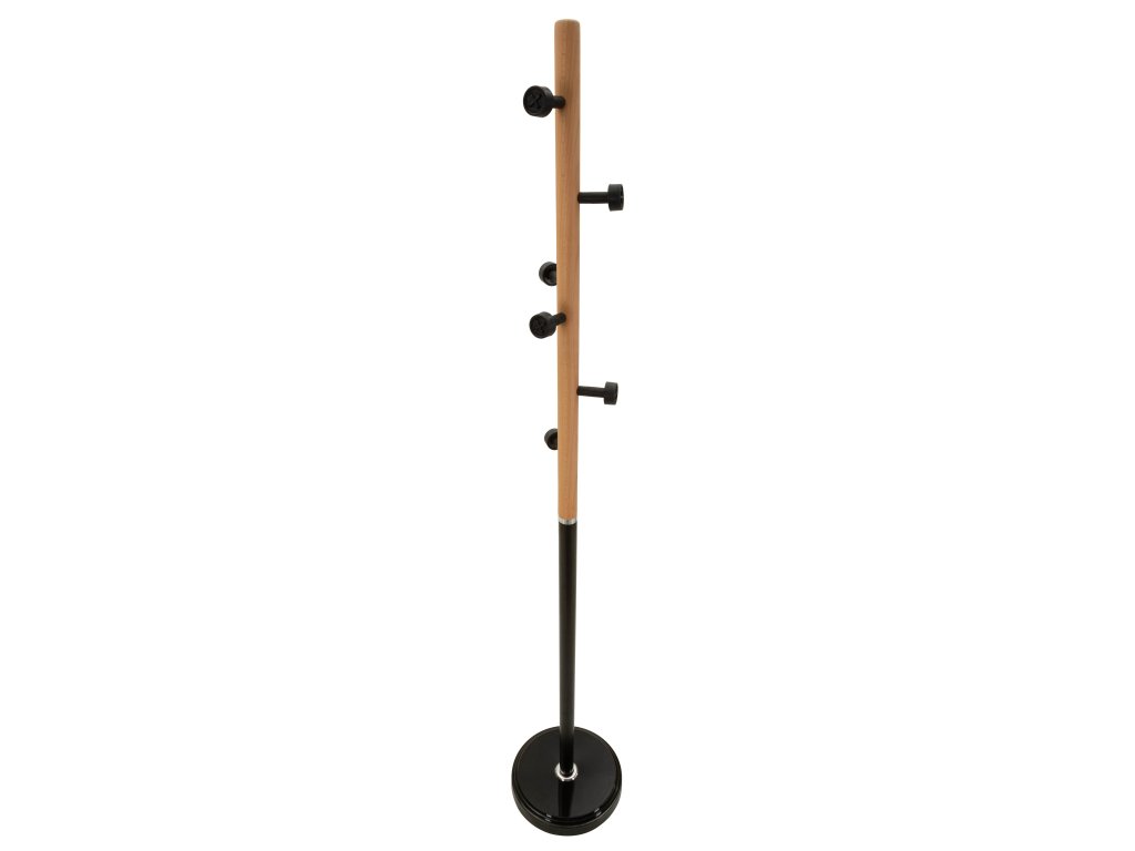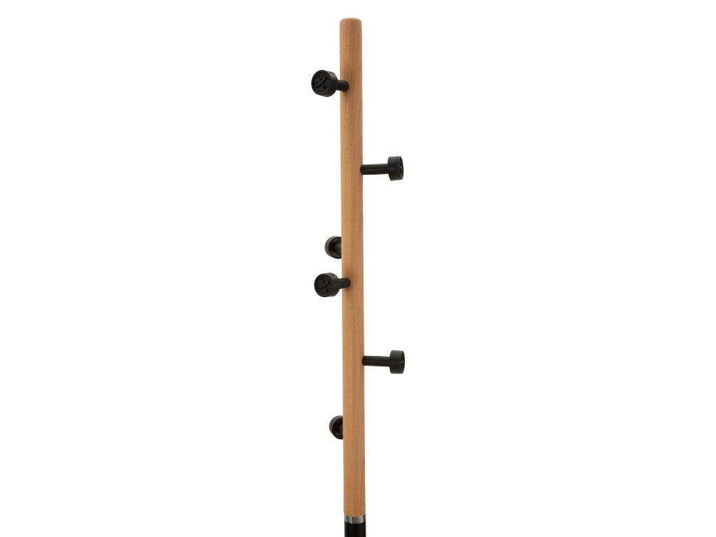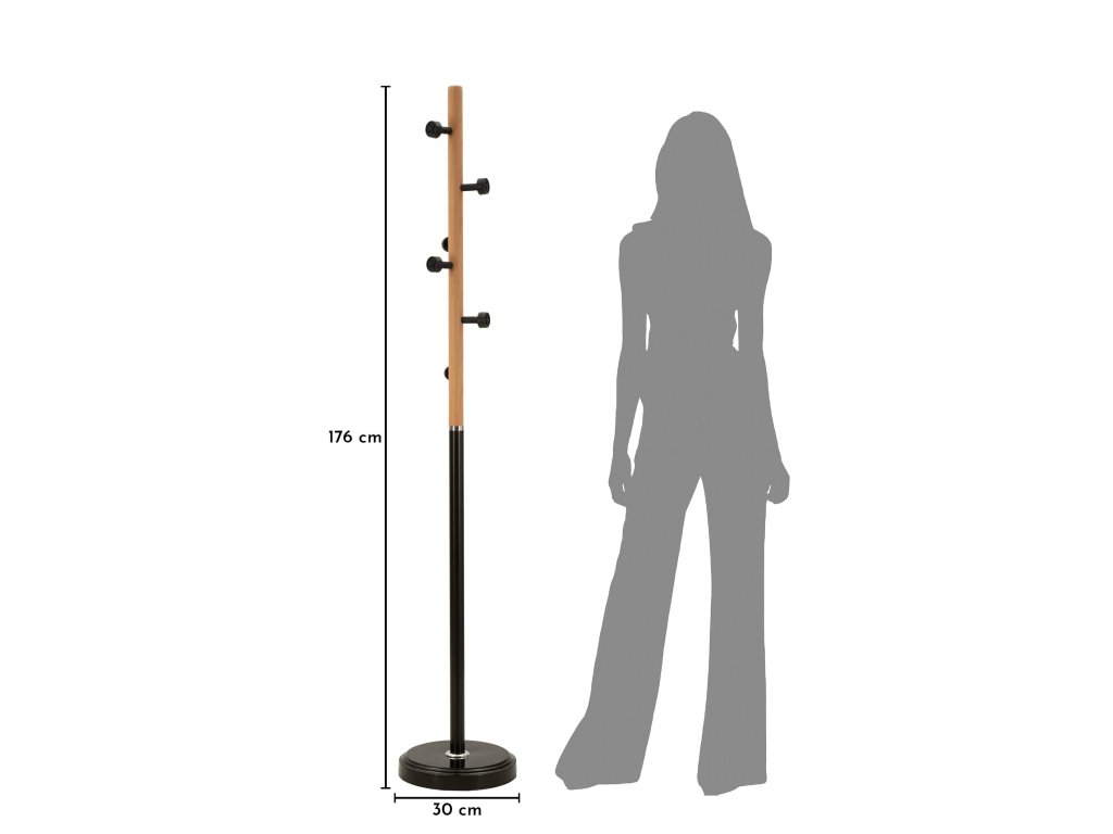 Konštrukcia vešiaka je vyrobená z kombinácie kovu a dubového dreva, čo vytvára harmonický kontrast medzi moderným a prírodným materiálom. Kovová časť v čiernej farbe zabezpečuje stabilitu a pevnosť, zatiaľ čo drevené detaily z dubového dreva v hnedom odtieni dodávajú nábytku teplo a prirodzený charakter.