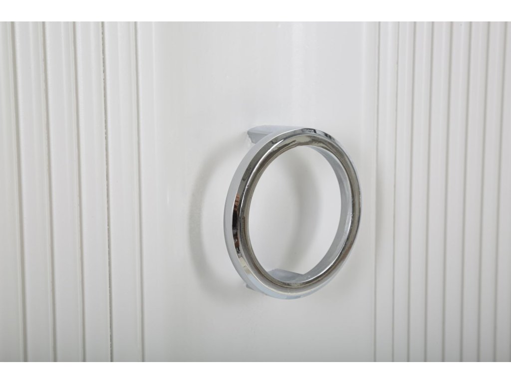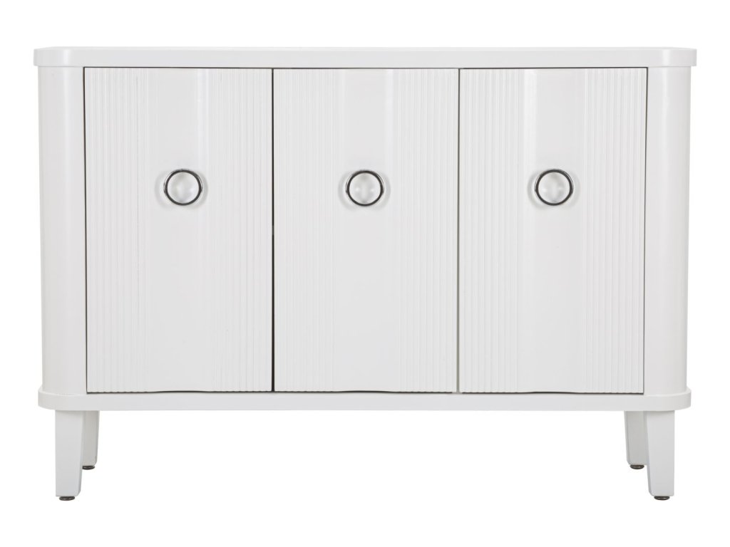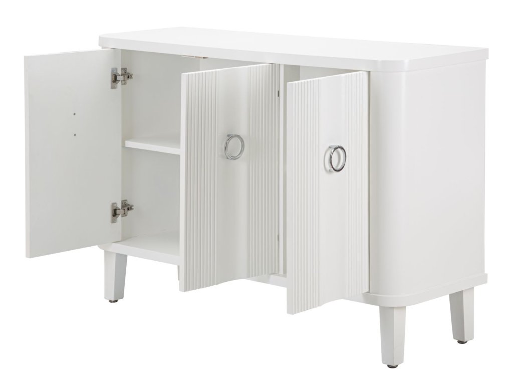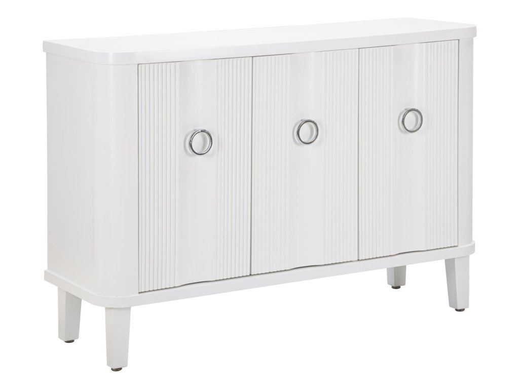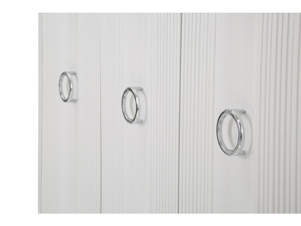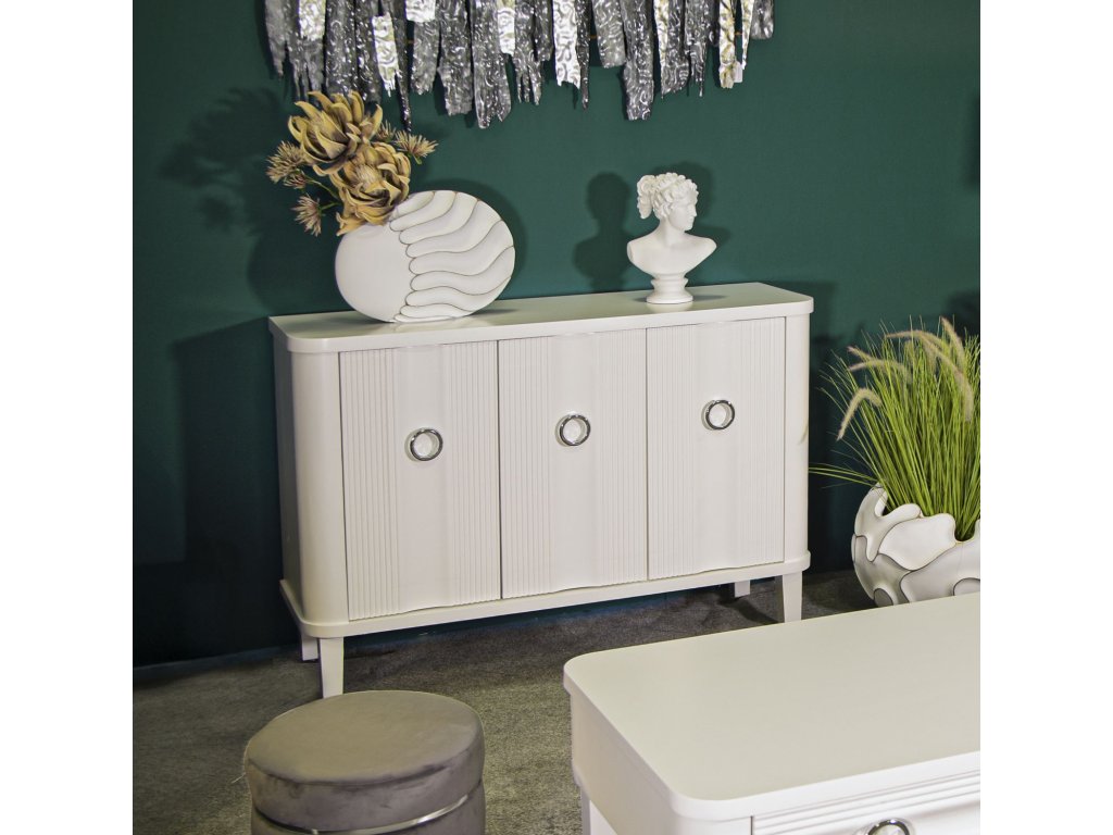 Komoda je vybavená tromi praktickými dvierkami s elegantnými kruhovými úchytkami, ktoré zabezpečujú jednoduché otváranie a zatváranie. Vďaka svojmu vkusnému dizajnu a nadčasovému vzhľadu sa ľahko zapadne do rôznych štýlov zariadenia a poskytne dostatok priestoru na uloženie oblečenia, dekorácií alebo iných vecí.