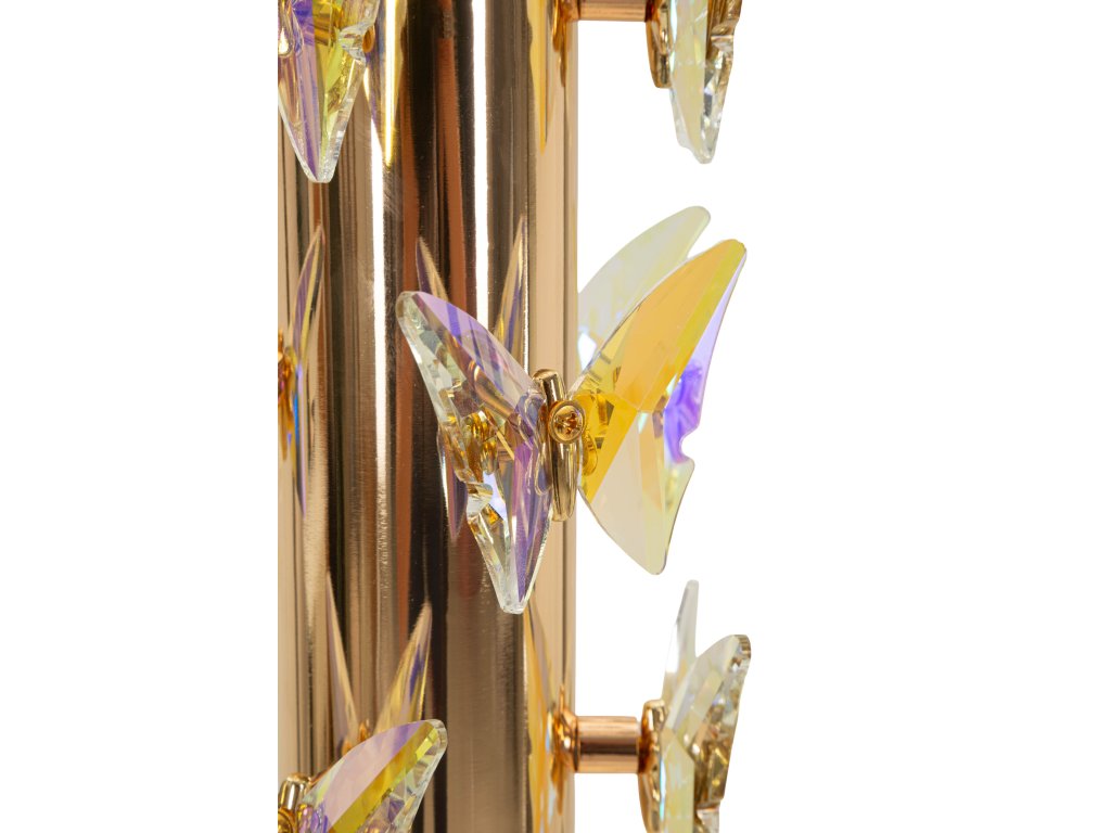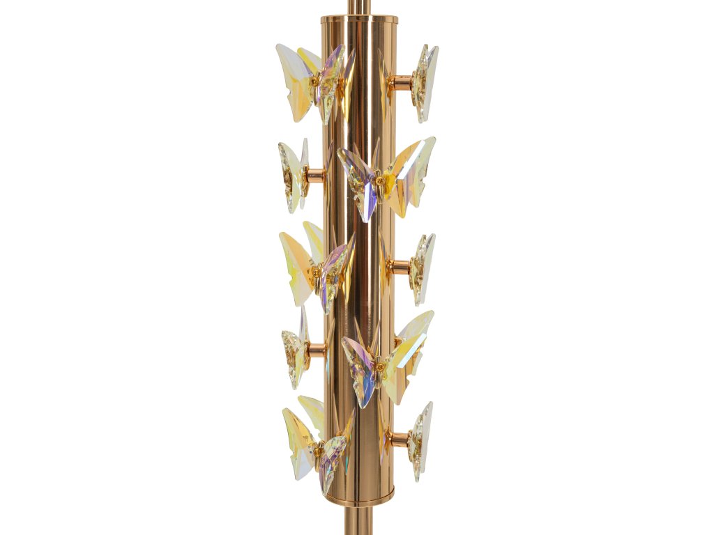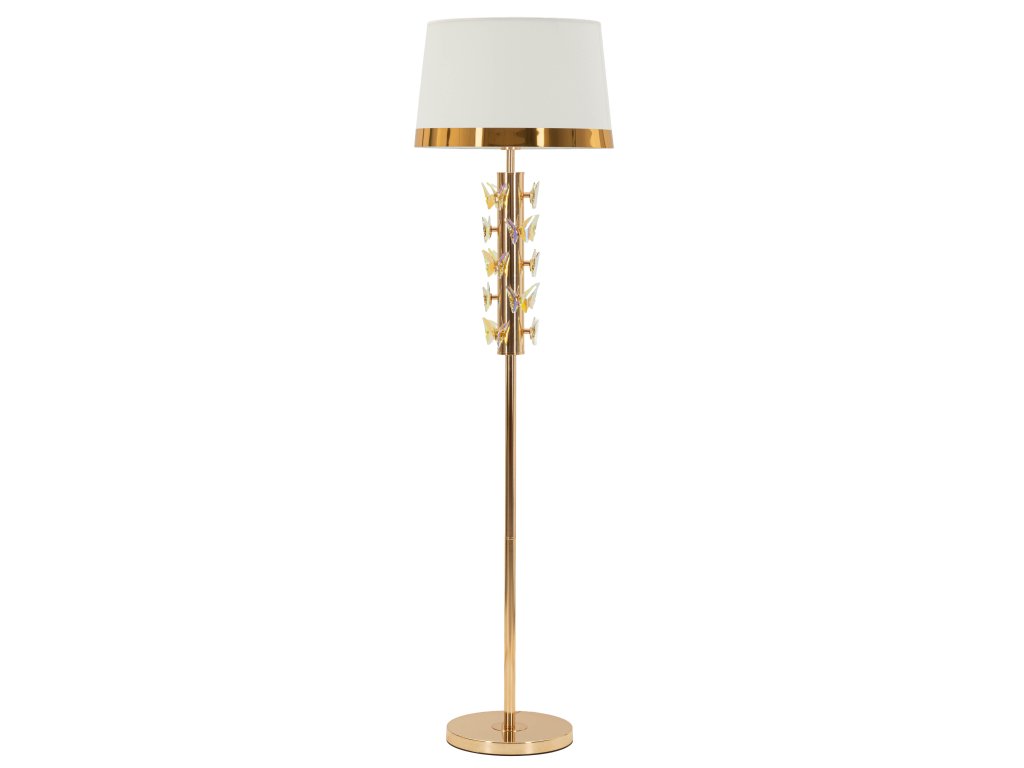 Dominantným prvkom lampy je zlatá kovová základňa a stĺpik doplnený dekoratívnymi motýľmi, ktoré dodávajú svietidlu jedinečný a scenický charakter. Biele textilné tienidlo so zlatým lemom elegantne rozptyľuje svetlo a vytvára príjemnú atmosféru v miestnosti.