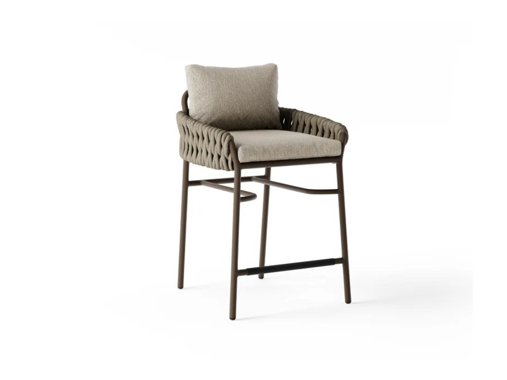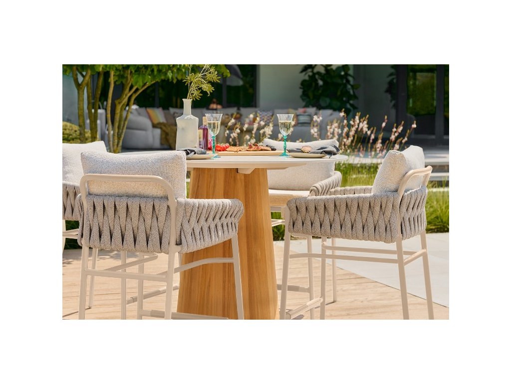 Záhradná low bar stolička SUNS Fiave spája elegantný dizajn s komfortom lounge sedenia. Jemné zaoblené línie, bohato tkaná rope opierka a mäkké bouclé vankúše vytvárajú luxusný a zároveň vzdušný vzhľad, ktorý dokonale doplní modernú barovú zostavu na terase či v záhrade.