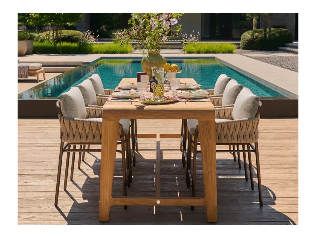 Charakteristickým prvkom stoličky je vertikálne tkaný outdoorový rope výplet, ktorý dodáva dizajnu jedinečnú textúru a zároveň poskytuje príjemnú oporu chrbtu. Komfort dopĺňa mäkký vankúš z kvalitnej bouclé outdoorovej látky, ktorá pôsobí luxusne a zároveň je vhodná na použitie v exteriéri.