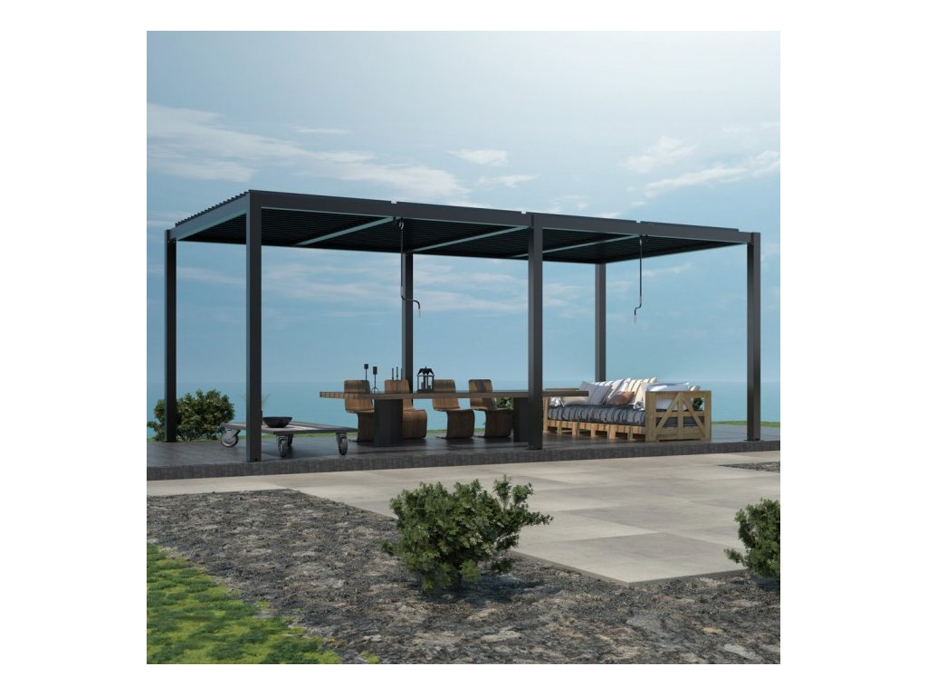 Pergolu možno uzavrieť pomocou žalúziových panelov alebo markíz. Takto si vytvoríte priestor, ktorý vám umožní relaxovať bez ohľadu na počasie. Obklad stien je možné ľubovoľne konfigurovať a vytvoriť tak priestor, ktorý bude optimálne vyhovovať vašim potrebám. Výhodou pergoly je strecha vybavená pohodlným systémom manuálneho otvárania, ktorý umožňuje prispôsobiť zatienenie individuálnym očakávaniam.