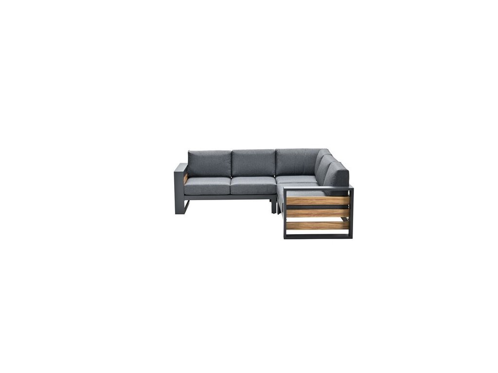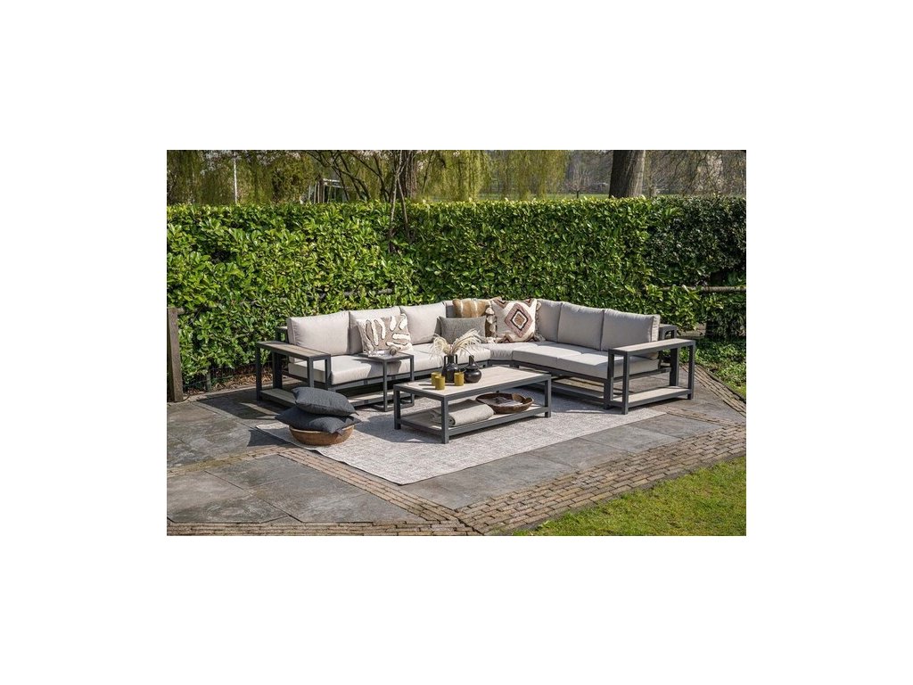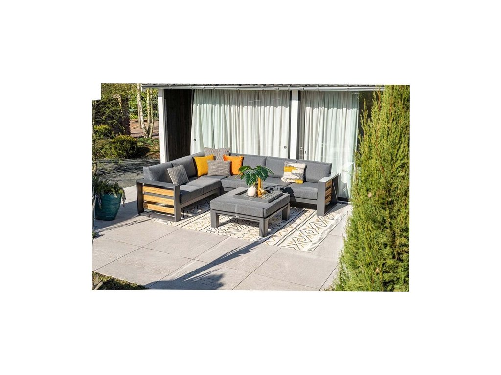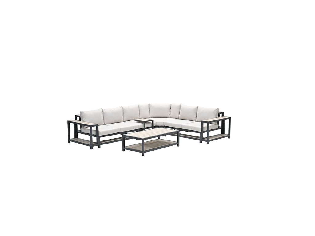 S rohovou záhradnou sedacou súpravou GENOA prinesiete do Vašej záhrady fantastické a nenáročné sedenie. Táto rohová sedacia súprava obsahuje šesť častí: rohový diel, dve bočné časti a samozrejme súčasťou sú aj konferenčné stolíky , ktorých doska má vzhľad prírodne bledého teaku avšak je vyrobená z odolného plastu Vironwood. Záhradná sedacia súprava obsahuje 14 vankúšov. Pekným a vkusným detailom sú podrúčky s potlačou v teakovom vzhľade, ktoré v kombinácii s antracitovou hliníkovou konštrukciou dodávajú súprave luxusný vzhľad. Hliníkový záhradný nábytok sa v poslednej dobe teší obľube, pretože je nenáročný na údržbu a odolný voči poveternorstným podmienkam.Priestranná rohová sedacia súprava Genoa má praktické poličky okolo celej sedacej súpravy. Na podrúčkach aj za operadlami sú namontované poličky, takže máte vždy miesto na odkladanie nápojov.