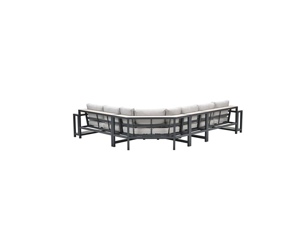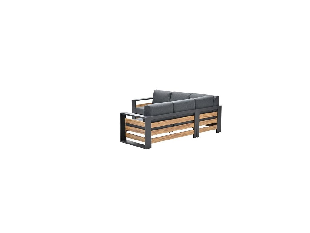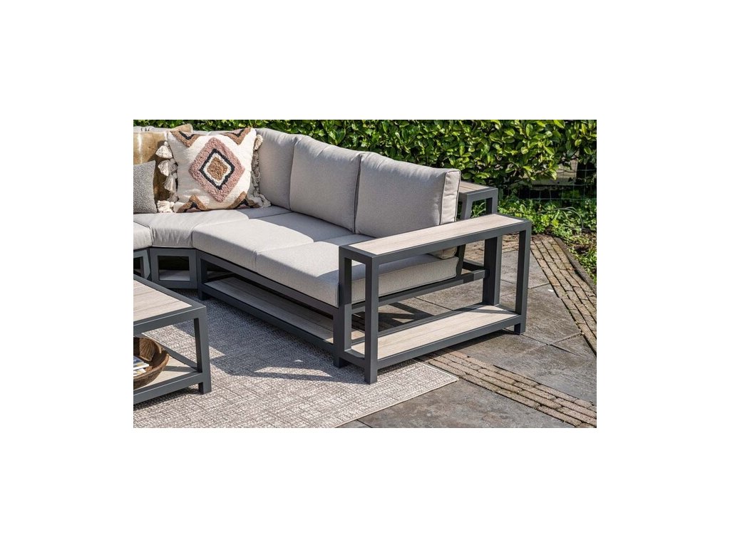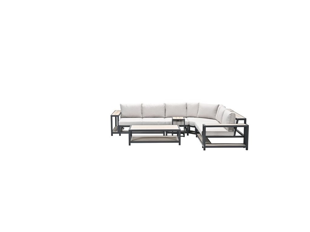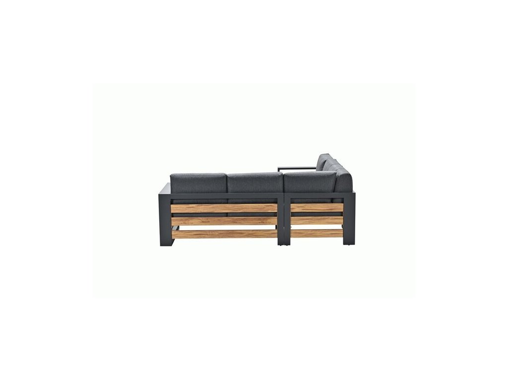 S rohovou záhradnou sedacou súpravou GENOA prinesiete do Vašej záhrady fantastické a nenáročné sedenie. Táto rohová sedacia súprava obsahuje šesť častí: rohový diel, dve bočné časti a samozrejme súčasťou sú aj konferenčné stolíky , ktorých doska má vzhľad prírodne bledého teaku avšak je vyrobená z odolného plastu Vironwood. Záhradná sedacia súprava obsahuje 14 vankúšov. Pekným a vkusným detailom sú podrúčky s potlačou v teakovom vzhľade, ktoré v kombinácii s antracitovou hliníkovou konštrukciou dodávajú súprave luxusný vzhľad. Hliníkový záhradný nábytok sa v poslednej dobe teší obľube, pretože je nenáročný na údržbu a odolný voči poveternorstným podmienkam.Priestranná rohová sedacia súprava Genoa má praktické poličky okolo celej sedacej súpravy. Na podrúčkach aj za operadlami sú namontované poličky, takže máte vždy miesto na odkladanie nápojov.