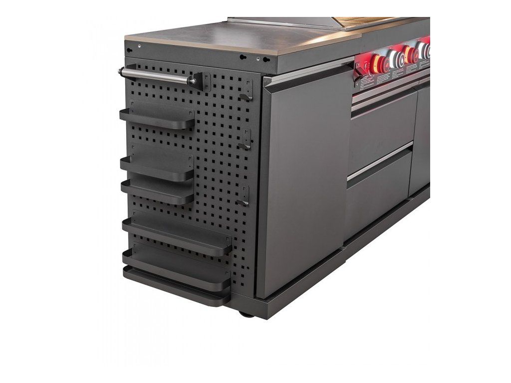 Pracovné plochy z technického spekaného kameňa dodávajú kuchyni moderný vzhľad a vysokú odolnosť voči teplu aj mechanickému poškodeniu. Modulárna konštrukcia na kolieskach umožňuje jednoduché premiestňovanie a prispôsobenie priestoru. Praktickým doplnkom je aj integrovaný otvárač na fľaše.