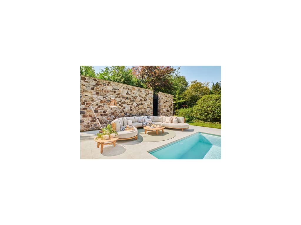Súčasťou setu môžu byť aj organicky tvarované konferenčné stolíky z masívneho teaku, ktoré perfektne ladia so sedačkami a zároveň poskytujú praktický priestor na odloženie nápojov či dekorácií.