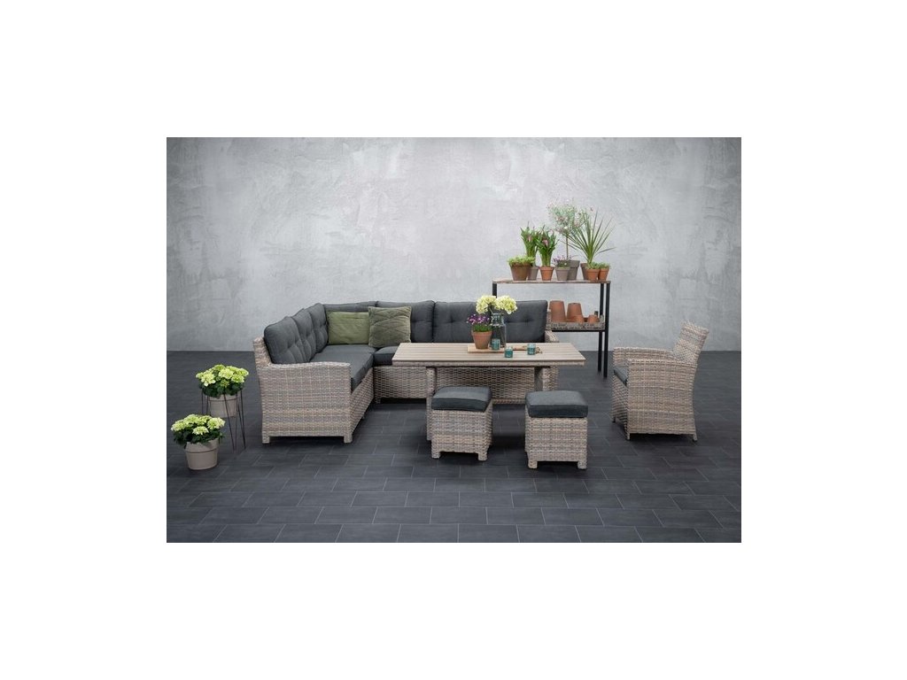 Záhradný nábytok má pevný a ľahký hliníkový rám, opletený ručne pleteným prútím v tvare "L", ktoré poskytuje naozaj robustný a vznešený vzhľad. Výplet z polyetylénu je mimoriadne pevný, nenáročný na údržbu a odolný voči rôznym poveternostným podmienkam. Pohodlné čierne vankúše sú súčasťou štandardnej výbavy. Tieto vankúše majú PU výplň, vďaka čomu sú odolné voči špine a vode. Po krátkom a nečakanom daždi môžete vodu jednoducho striasť. Záhradný stôl je krásne vypracovaný a jeho korunu tvorí doska z polywoodu - syntetická náhrada dreva, ktorá je štruktúrou podobná skutočnému drevu a ľahko sa udržiava. Pre optimálnu ochranu je k dispozícii multifunkčný čistič a chránič Polywood.