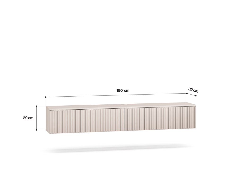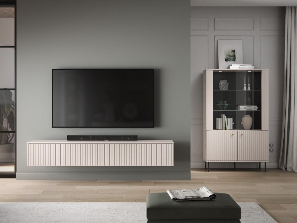 TV skrinka Sophie je moderná závesná skrinka pod televízor, ktorá vyniká elegantným dizajnom a praktickým využitím. Kašmírové prevedenie v kombinácii s frézovanými MDF frontmi dodáva nábytku luxusný a nadčasový vzhľad, typický pre kolekciu Sophie.